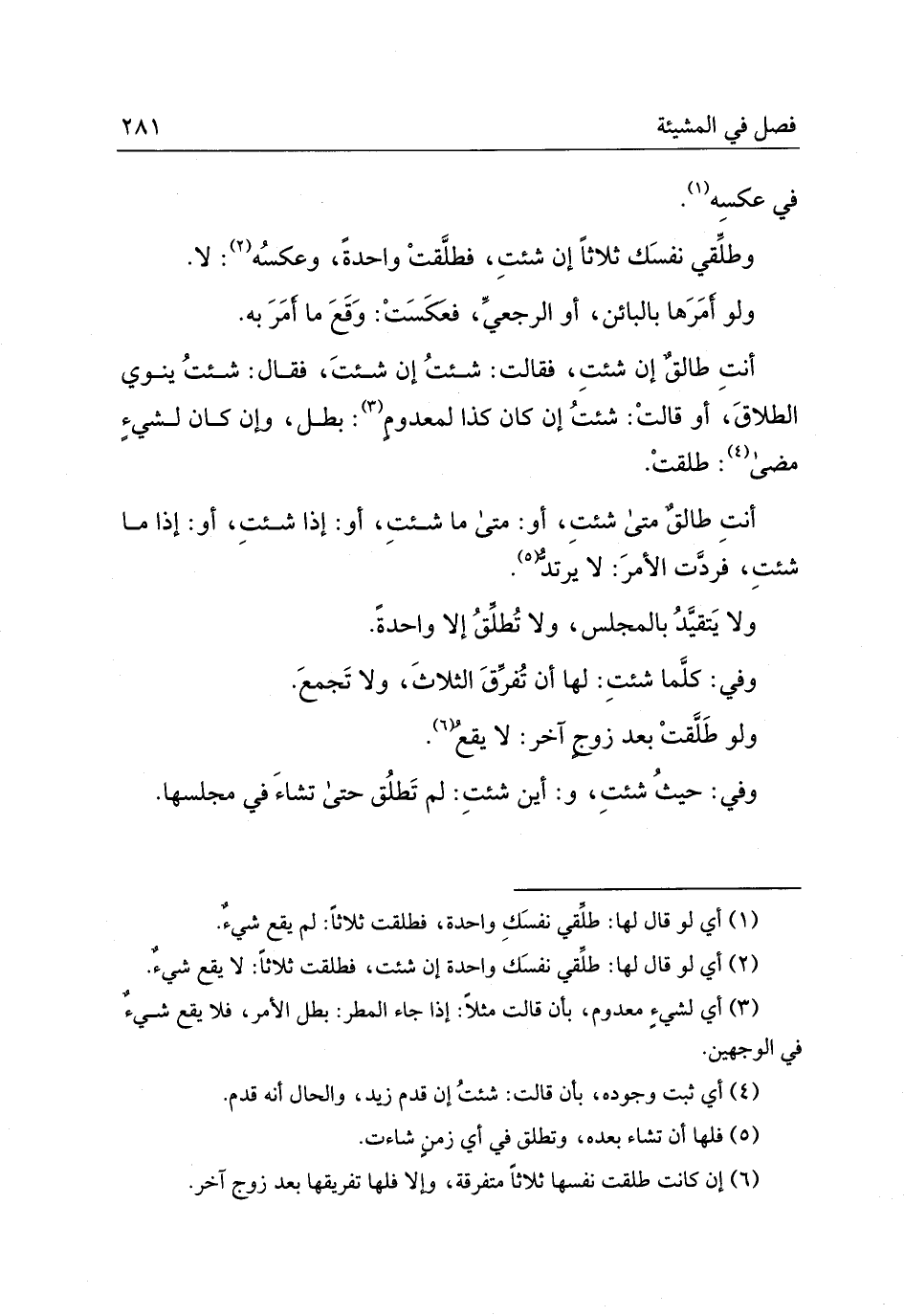 وأنت طالقٌ متى شئت أو متى ما شئت أو إذا شئت أو إذا ما شئت فردّت الأمر لا يرتدّ