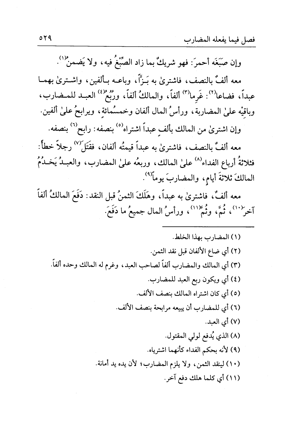 معه ألفٌ بالنّصف فاشترى به عبدًا قيمته ألفان فقتل رجلًا خطأً فثلاثة أرباع الفداء على المالك وربعه على المضارب والعبد يخدم المالك ثلاثة أيّامٍ والمضارب يومًا