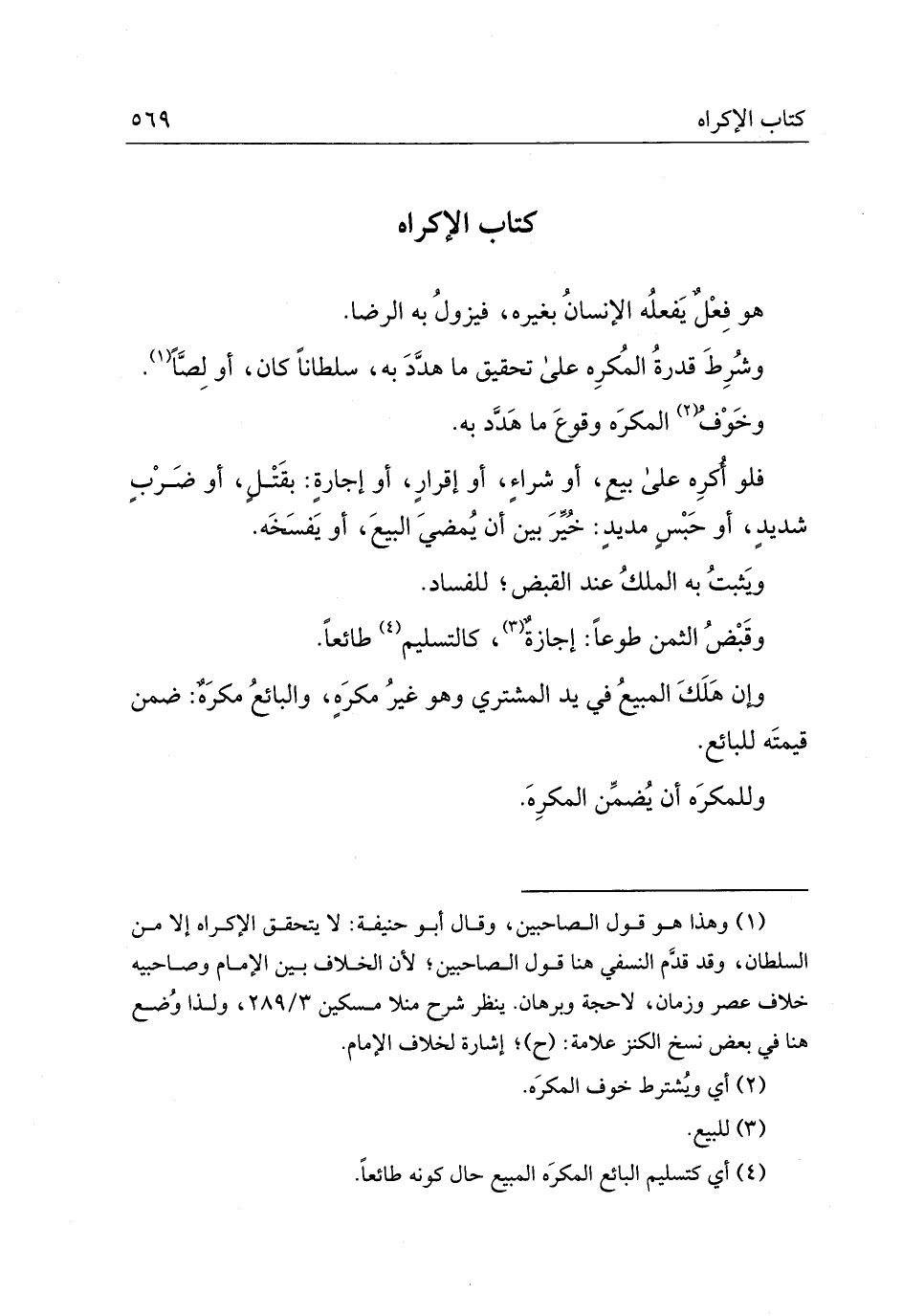 فلو أكره على بيعٍ أو شراءٍ أو إقرارٍ أو إجارةٍ بقتلٍ أو ضربٍ شديدٍ أو حبسٍ مديدٍ خيّر بين أن يمضي البيع أو يفسخه