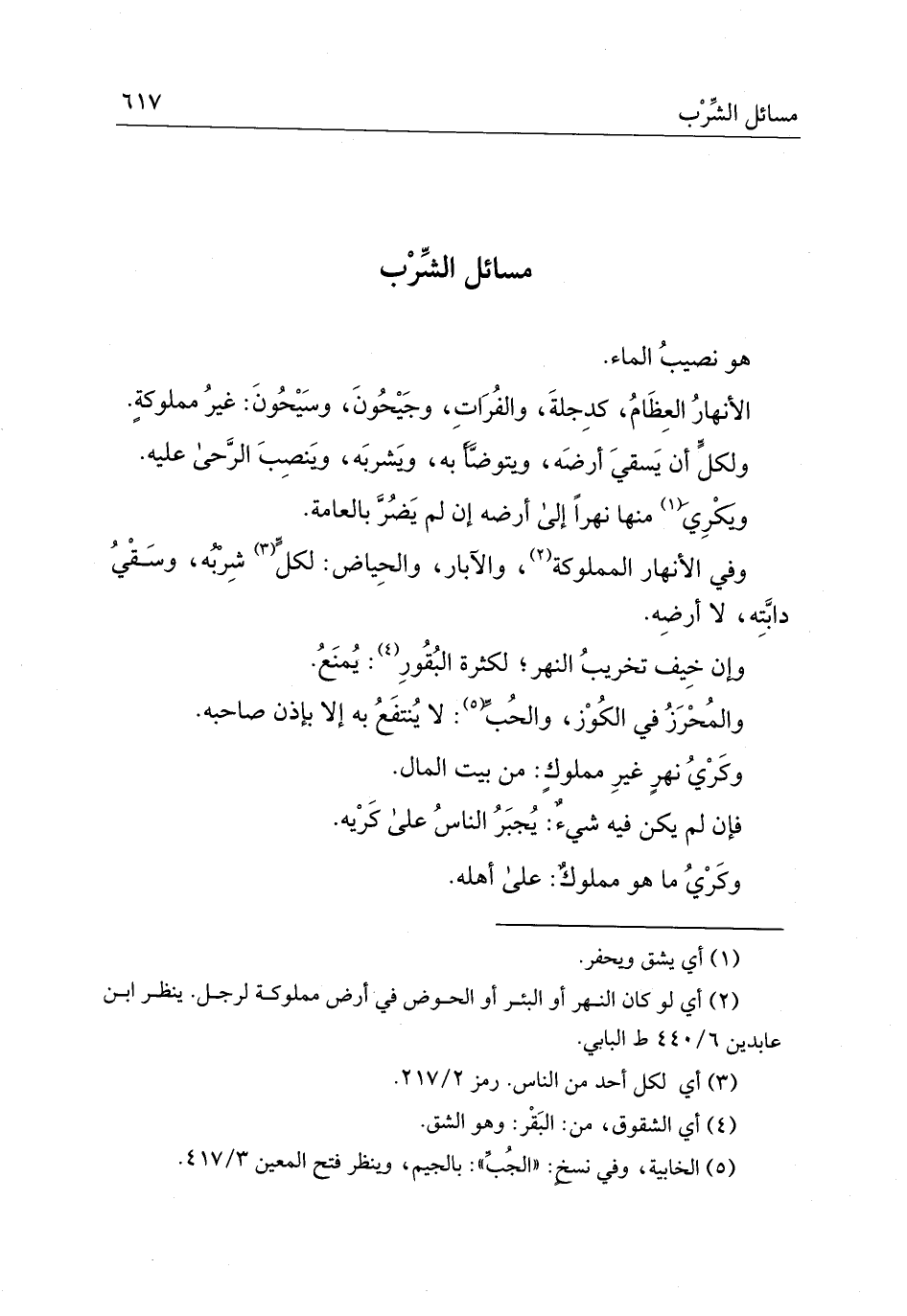 وفي الأنهار المملوكة والآبار والحياض لكلٍّ شربه وسقي دابته لا أرضه
