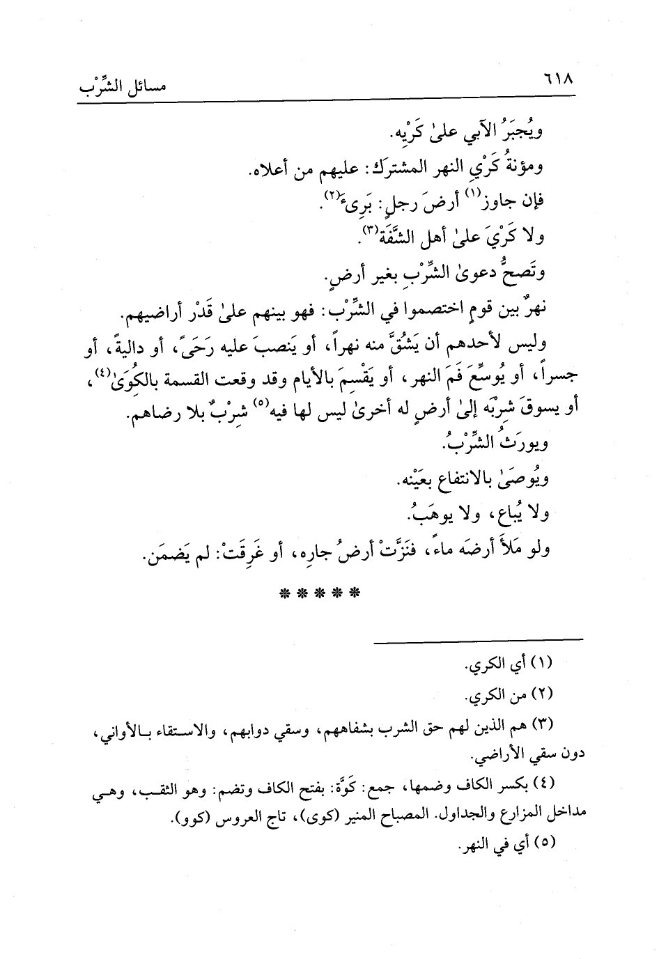 وليس لأحدٍ أن يشقّ منه نهرًا أو ينصب عليه رحًى أو داليةً أو جسرًا أو يوسّع فم النّهر أو يقسم بالأيّام، وقد وقع القسمة بالكوى أو يسوق نصيبه إلى أرضٍ له أخرى ليس لها فيه شربٌ بلا رضاهم
