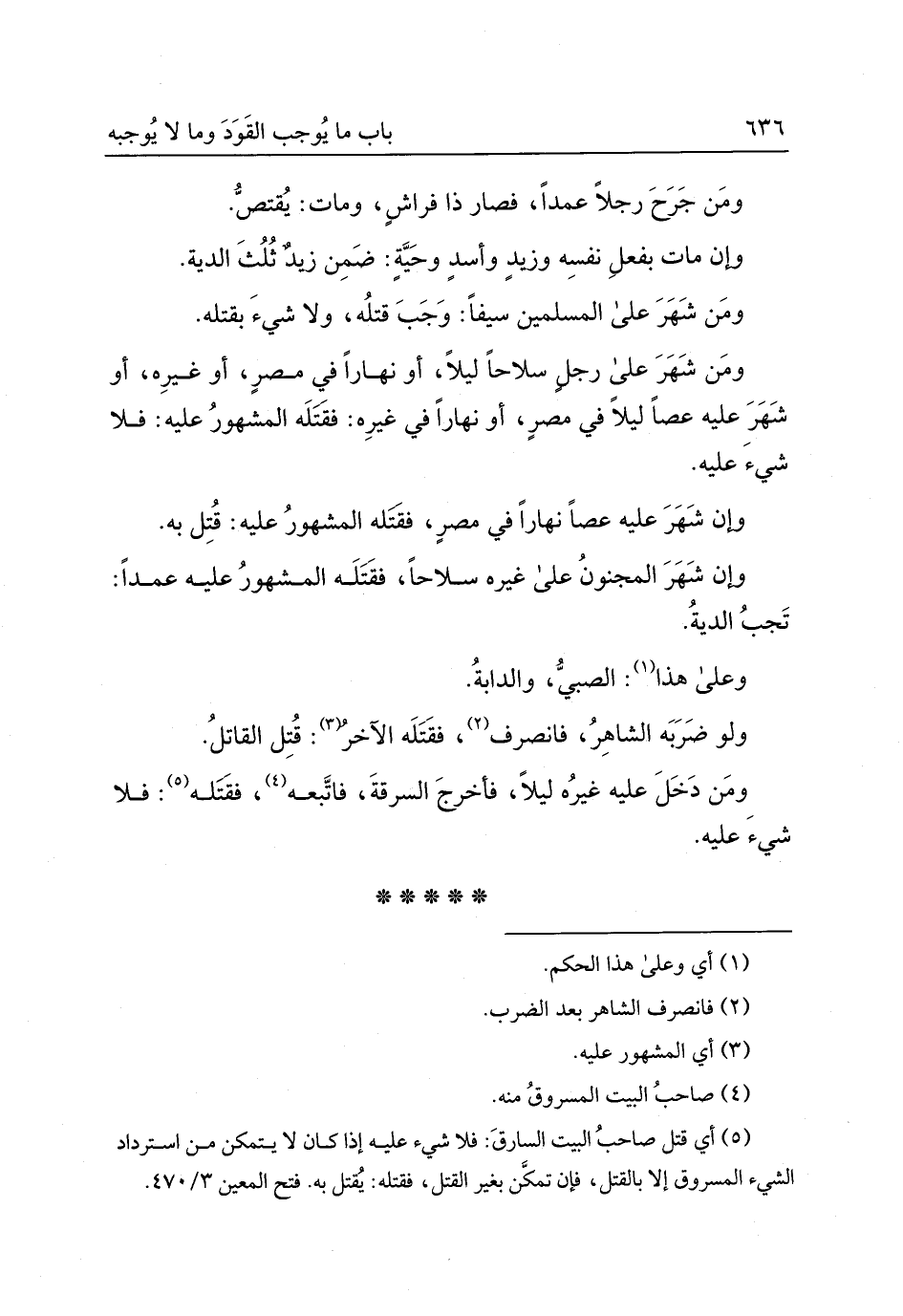 ومن شهر على رجلٍ سلاحًا ليلًا أو نهارًا في المصر أو غيره أو شهر عليه عصا ليلًا في مصرٍ أو نهارًا في غيره فقتله المشهور عليه فلا شيء عليه