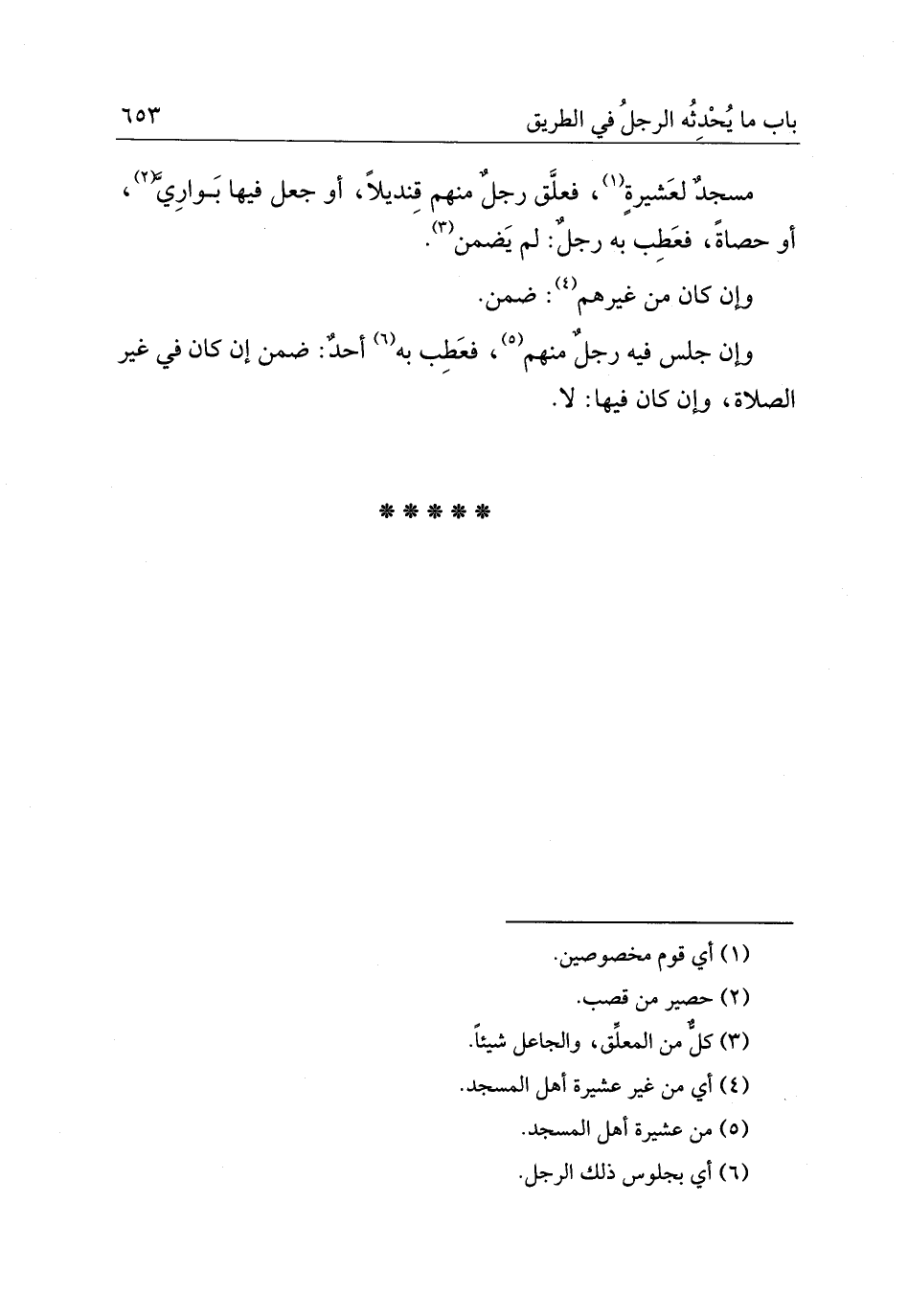 مسجدٌ لعشيرةٍ فعلّق رجلٌ منهم قنديلًا أو جعل فيه بواري أو حصاةً فعطب به رجلٌ لم يضمن
