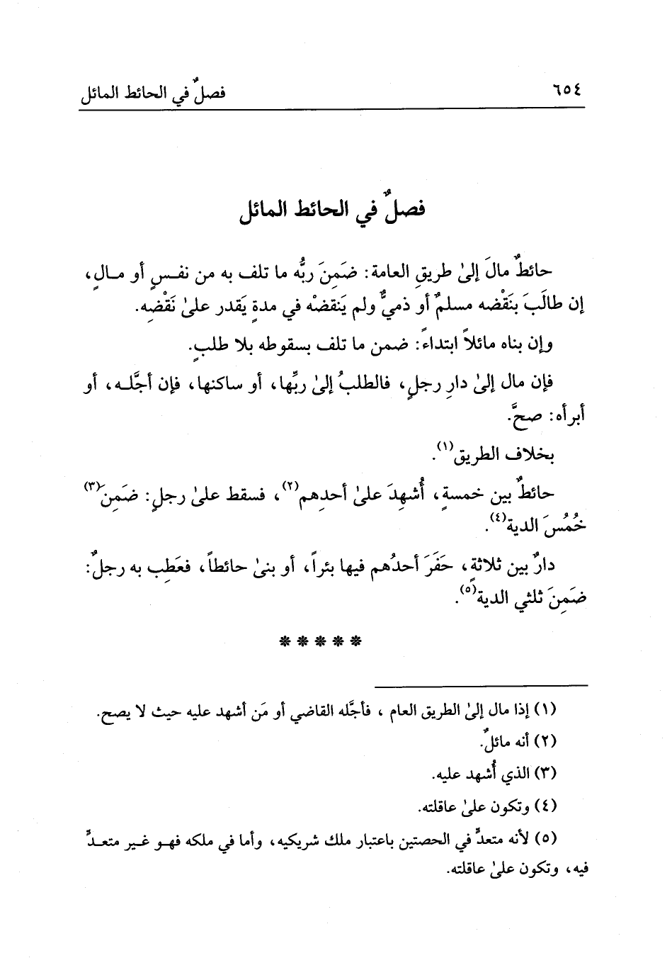 حائطٌ مائلٌ إلى طريق العامّة ضمن ربّه ما تلف به من نفسٍ أو مالٍ إن طالب بنقضه مسلمٌ أو ذمّيٌّ ولم ينقضه في مدّةٍ يقدر على نقضه