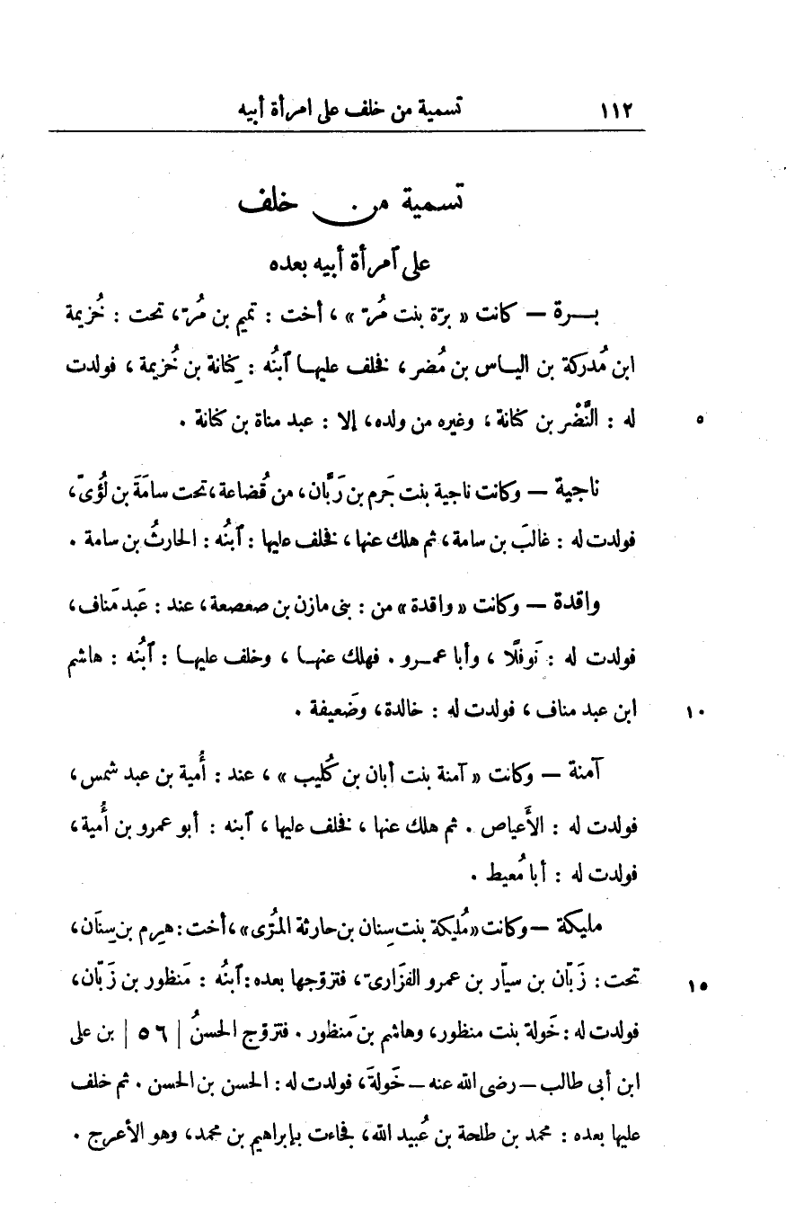 واقدة- وكانت «واقدة» من: بنى مازن بن صعصعة، عند: عبد مناف، فولدت له: نوفلا، وأبا عمرو. فهلك عنها، وخلف عليها: ابنه: هاشم ابن عبد مناف، فولدت له: خالدة، وضعيفة.