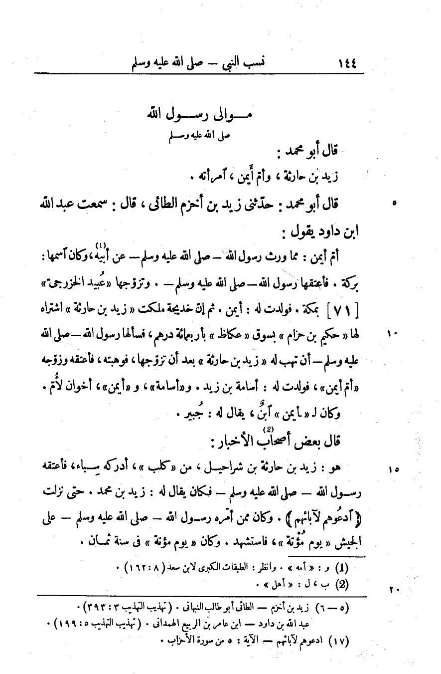 بركة. فأعتقها رسول الله- صلّى الله عليه وسلم-. وتزوّجها «عبيد الخزرجىّ» / 71/ بمكة. فولدت له: أيمن. ثم إنّ خديجة ملكت «زيد بن حارثة» اشتراه لها «حكيم بن حزام» بسوق «عكاظ» بأربعمائة درهم، فسألها رسول الله- صلّى الله عليه وسلم- أن تهب له «زيد بن حارثة» بعد أن تزوّجها، فوهبته، فأعتقه وزوّجه «أمّ أيمن» ، فولدت له: أسامة بن زيد. و «أسامة» ، و «أيمن» ، أخوان لأمّ.