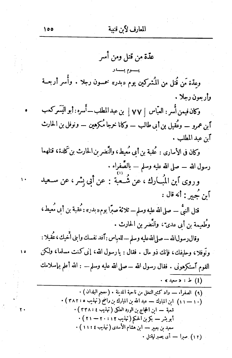 وكان في الأسارى: عقبة بن أبى معيط، والنّضر بن الحارث بن كلدة، قتلهما رسول الله- صلّى الله عليه وسلم- بالصّفراء. «1» وروى ابن المبارك، عن شعبة [1] : عن أبى بشر، عن سعيد ابن جبير «2» : أنه قال: