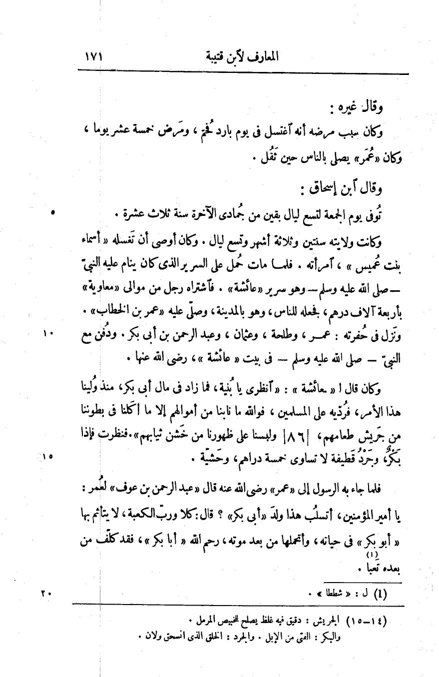 وكان قال ل «عائشة» : «انظري يا بنية، فما زاد في مال أبى بكر، منذ ولينا هذا الأمر، فردّيه على المسلمين، فو الله ما نابنا من أموالهم إلا ما أكلنا في بطوننا من جريش طعامهم،/ 86/ ولبسنا على ظهورنا من خشن ثيابهم» . فنظرت فإذا بكر، وجرد «1» قطيفة لا تساوى خمسة دراهم، وحشيّة.