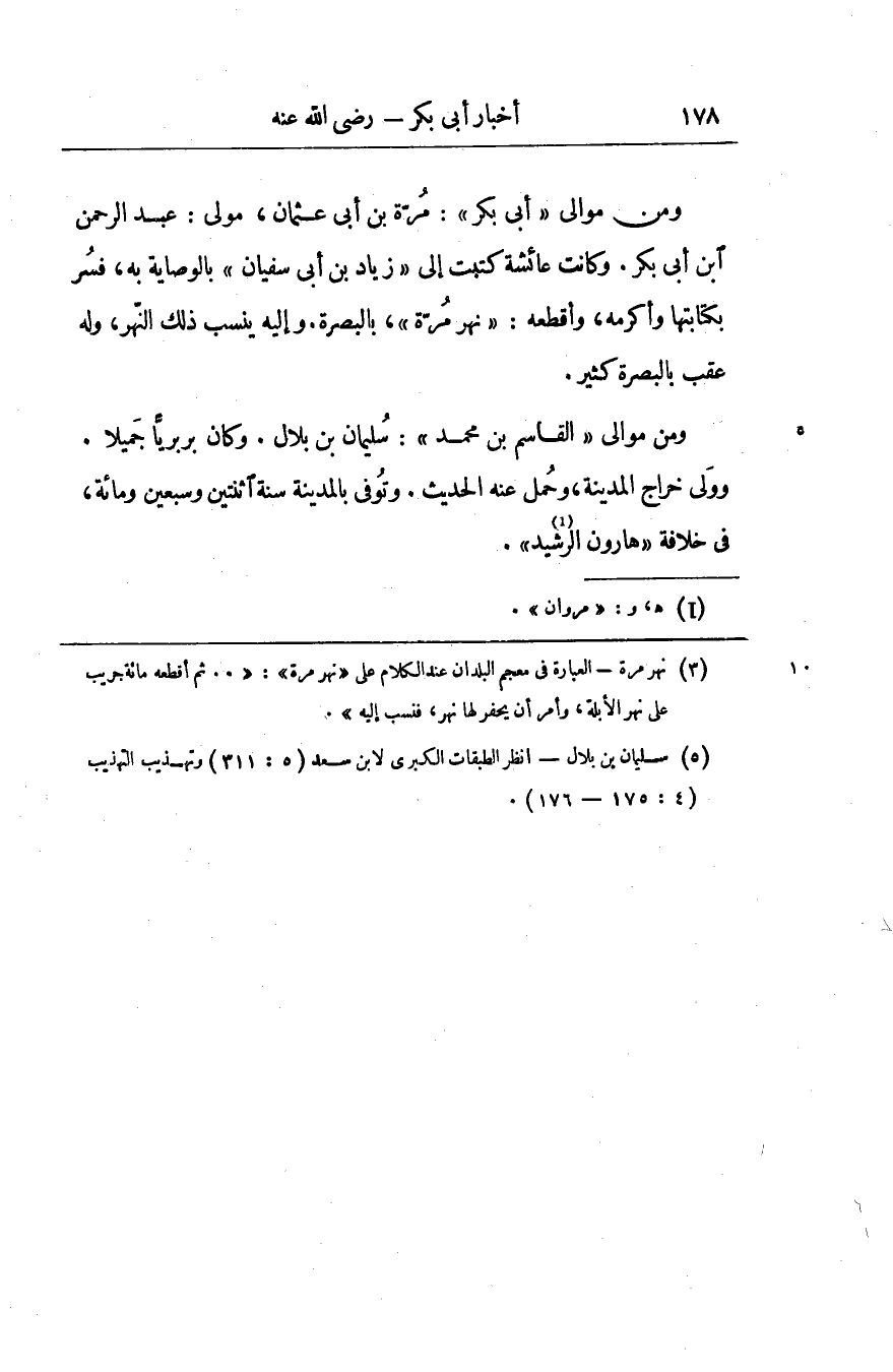 ومن موالي «أبى بكر» : مرّة بن أبى عثمان، مولى: عبد الرحمن ابن أبى بكر. وكانت عائشة كتبت إلى «زياد بن أبى سفيان» بالوصاية به، فسر بكتابتها وأكرمه، وأقطعه: «نهر مرّة» «1» ، بالبصرة. وإليه ينسب ذلك النّهر، وله عقب بالبصرة كثير.