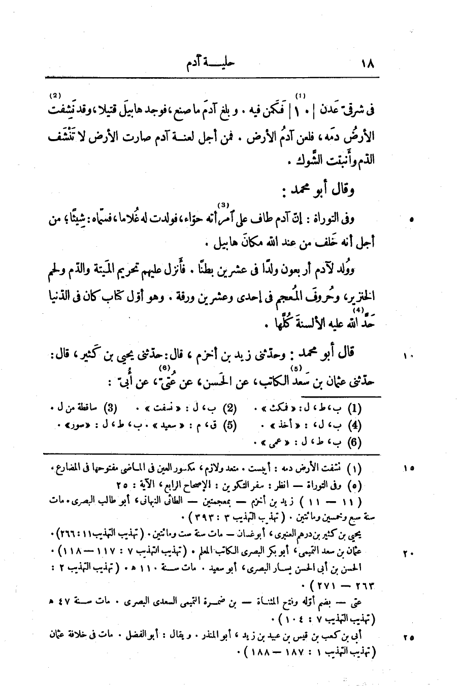 في شرقىّ عدن/ 10/ [1] فكمن فيه. وبلغ آدم ما صنع، فوجد هابيل قتيلا، وقد نشفت «1» [2] الأرض دمه، فلعن آدم الأرض. فمن أجل لعنة آدم صارت الأرض لا تنشف الدّم وأنبتت الشّوك.