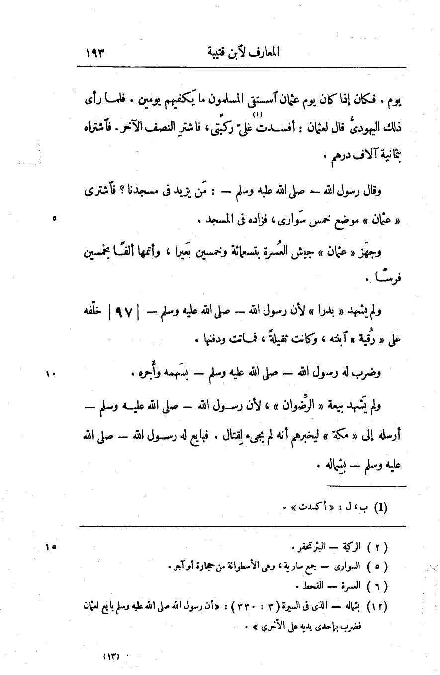 وقال رسول الله- صلّى الله عليه وسلّم-: من يزيد في مسجدنا؟ فاشترى «عثمان» موضع خمس سواري «2» ، فزاده في المسجد.