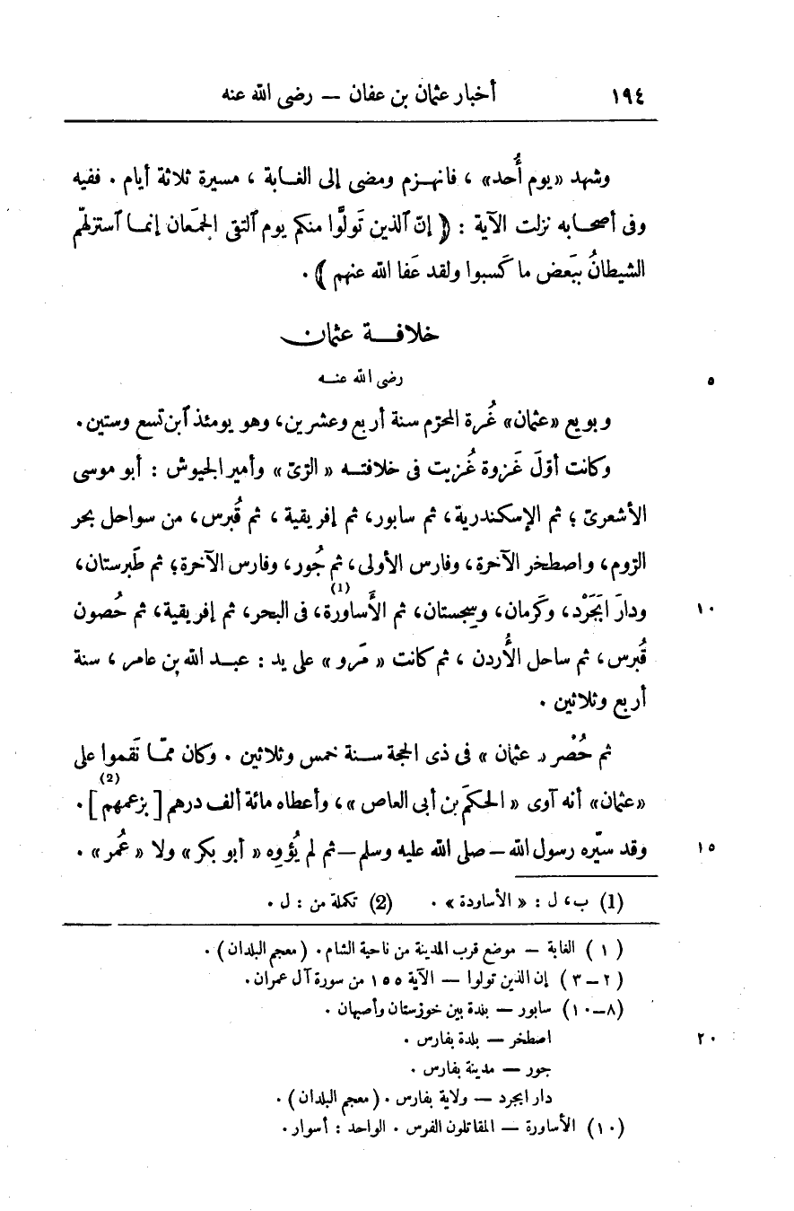 وكانت أوّل غزوة غزيت في خلافته «الرّيّ» وأمير الجيوش: أبو موسى الأشعريّ، ثم الإسكندرية، ثم سابور، ثم إفريقية، ثم قبرس، من سواحل بحر الرّوم، وإصطخر الآخرة، وفارس الأولى، ثم جور، وفارس الآخرة، ثم طبرستان، ودارابجرد «3» ، وكرمان، وسجستان، ثم الأساورة «4» [1] ، في البحر، ثم إفريقية، ثم حصون قبرس، ثم ساحل الأردن، ثم كانت «مرو» على يد: عبد الله بن عامر، سنة أربع وثلاثين.