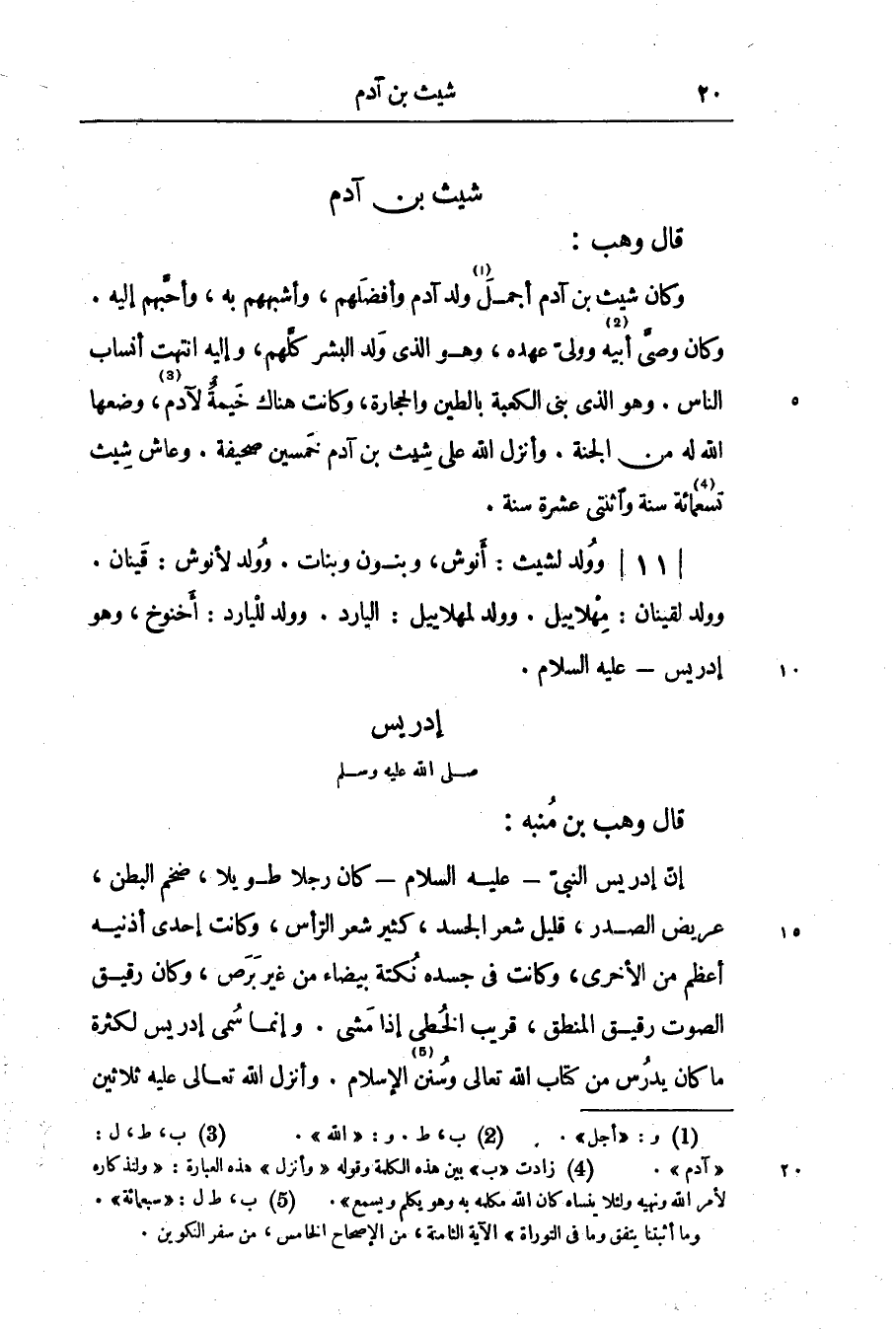 وكان وصيّ أبيه [2] وولىّ عهده، وهو الّذي ولد البشر كلّهم، وإليه انتهت أنساب الناس. وهو الّذي بنى الكعبة بالطين والحجارة، وكانت هناك خيمة لآدم، [3] وضعها الله له من الجنة. وأنزل الله على شيث بن آدم خمسين صحيفة. وعاش شيث تسعمائة [4] سنة واثنتي عشرة سنة.