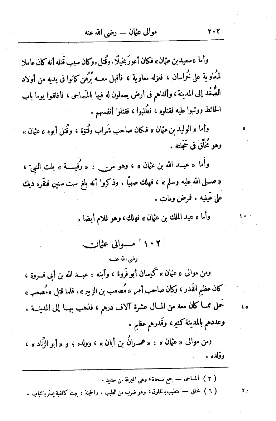 وأما «سعيد بن عثمان» فكان أعور بخيلا. وقتل. وكان سبب قتله أنه كان عاملا لمعاوية على خراسان، فعزله معاوية، فأقبل معه برهن كانوا في يديه من أولاد الصّغد إلى المدينة، وألقاهم في أرض يعملون له فيها بالمساحي «1» ، فأغلقوا يوما باب الحائط ووثبوا عليه فقتلوه، فطلبوا، فقتلوا أنفسهم.
