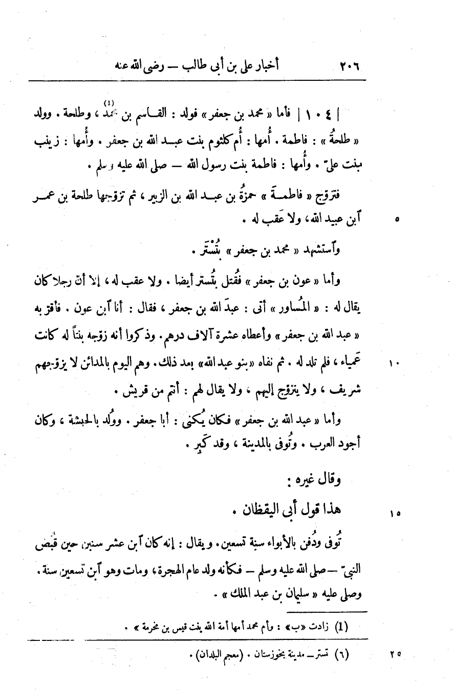 / 104/ فأما «محمد بن جعفر» فولد: القاسم بن محمد [1] ، وطلحة. وولد «طلحة» : فاطمة. أمها: أم كلثوم بنت عبد الله بن جعفر. وأمها: زينب بنت عليّ. وأمها: فاطمة بنت رسول الله- صلّى الله عليه وسلّم.