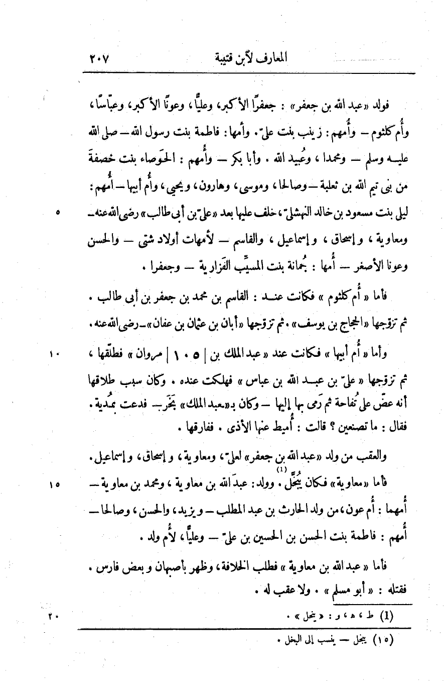 فولد «عبد الله بن جعفر» : جعفرا الأكبر، وعليّا، وعونا الأكبر، وعبّاسا، وأم كلثوم- وأمهم: زينب بنت عليّ. وأمها: فاطمة بنت رسول الله- صلّى الله عليه وسلّم- ومحمدا، وعبيد الله. وأبا بكر- وأمهم: الحوصاء بنت خصفة من بنى تيم الله بن ثعلبة- وصالحا، وموسى، وهارون، ويحيى، وأم أبيها- أمهم: