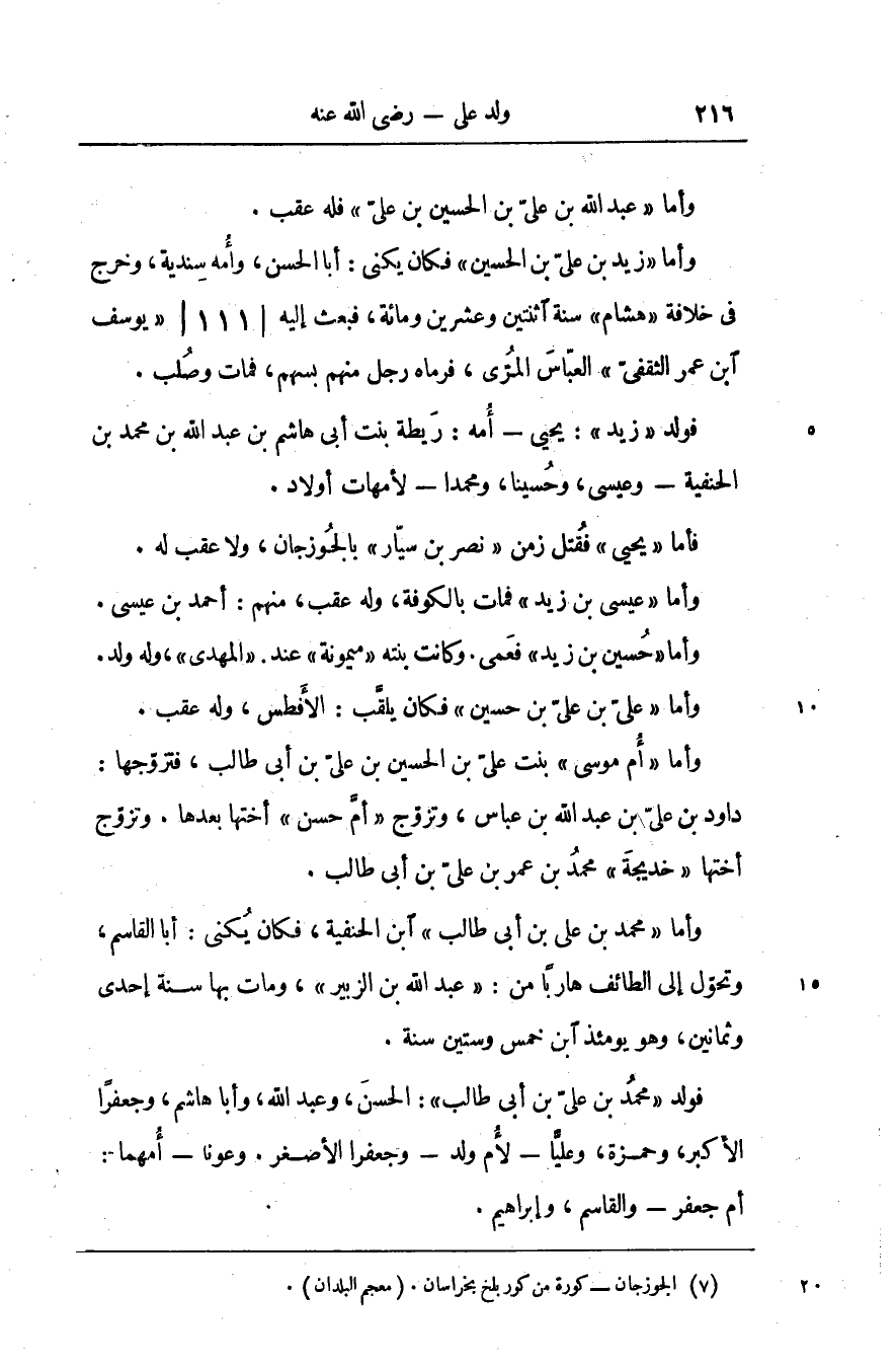 فولد «زيد» : يحيى- أمه: ريطة بنت أبى هاشم بن عبد الله بن محمد بن الحنفية- وعيسى، وحسينا، ومحمدا- لأمهات أولاد.