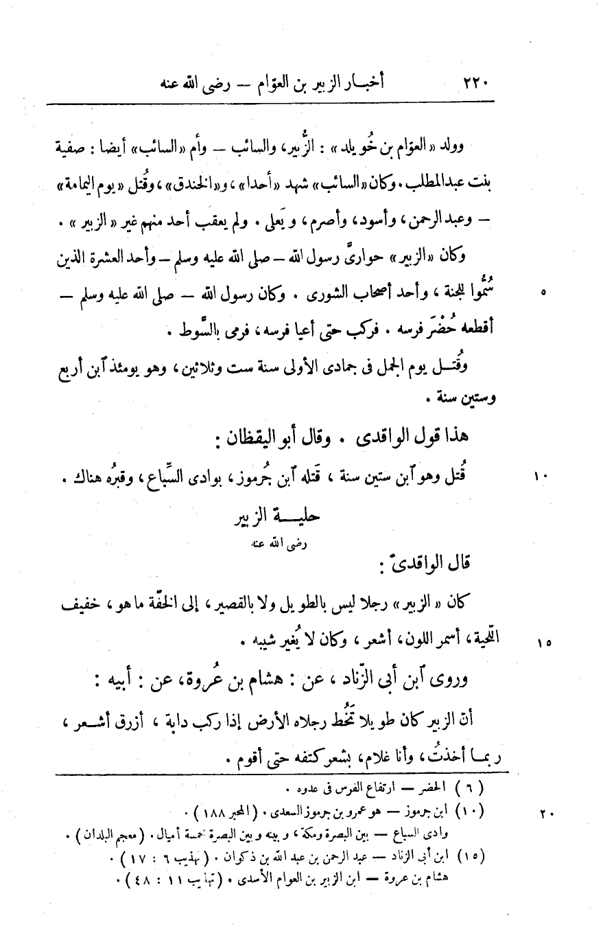 وكان «الزبير» حوارىّ رسول الله- صلّى الله عليه وسلّم- وأحد العشرة الذين سمّوا للجنة، وأحد أصحاب الشورى. وكان رسول الله- صلّى الله عليه وسلّم- أقطعه حضر «1» فرسه. فركب حتى أعيا فرسه، فرمى بالسّوط.