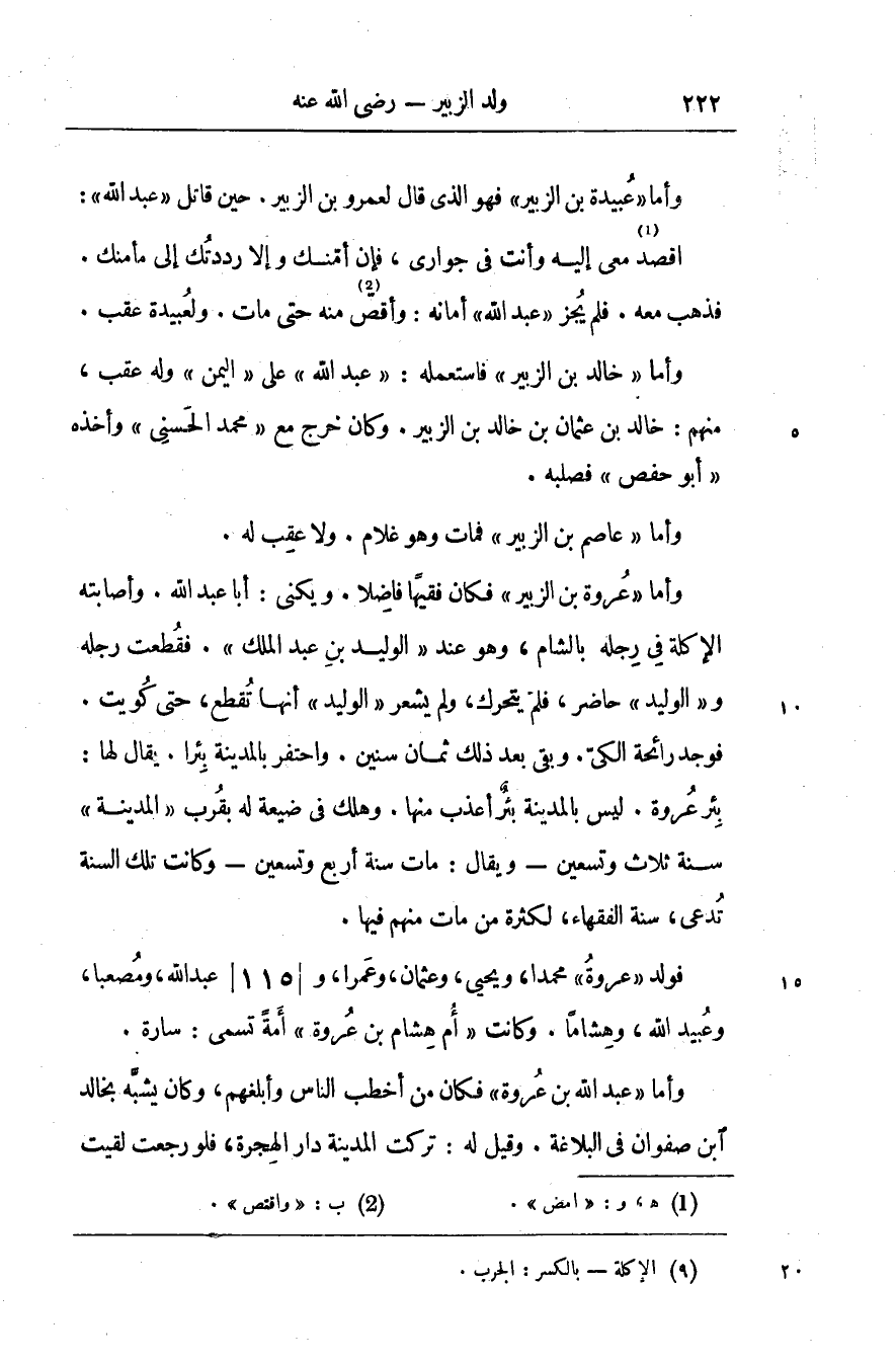 وأما «عروة بن الزبير» فكان فقيها فاضلا. ويكنى: أبا عبد الله. وأصابته الإكلة «1» في رجله بالشام، وهو عند «الوليد بن عبد الملك» . فقطعت رجله و «الوليد» حاضر، فلم يتحرك، ولم يشعر «الوليد» أنها تقطع، حتى كويت.