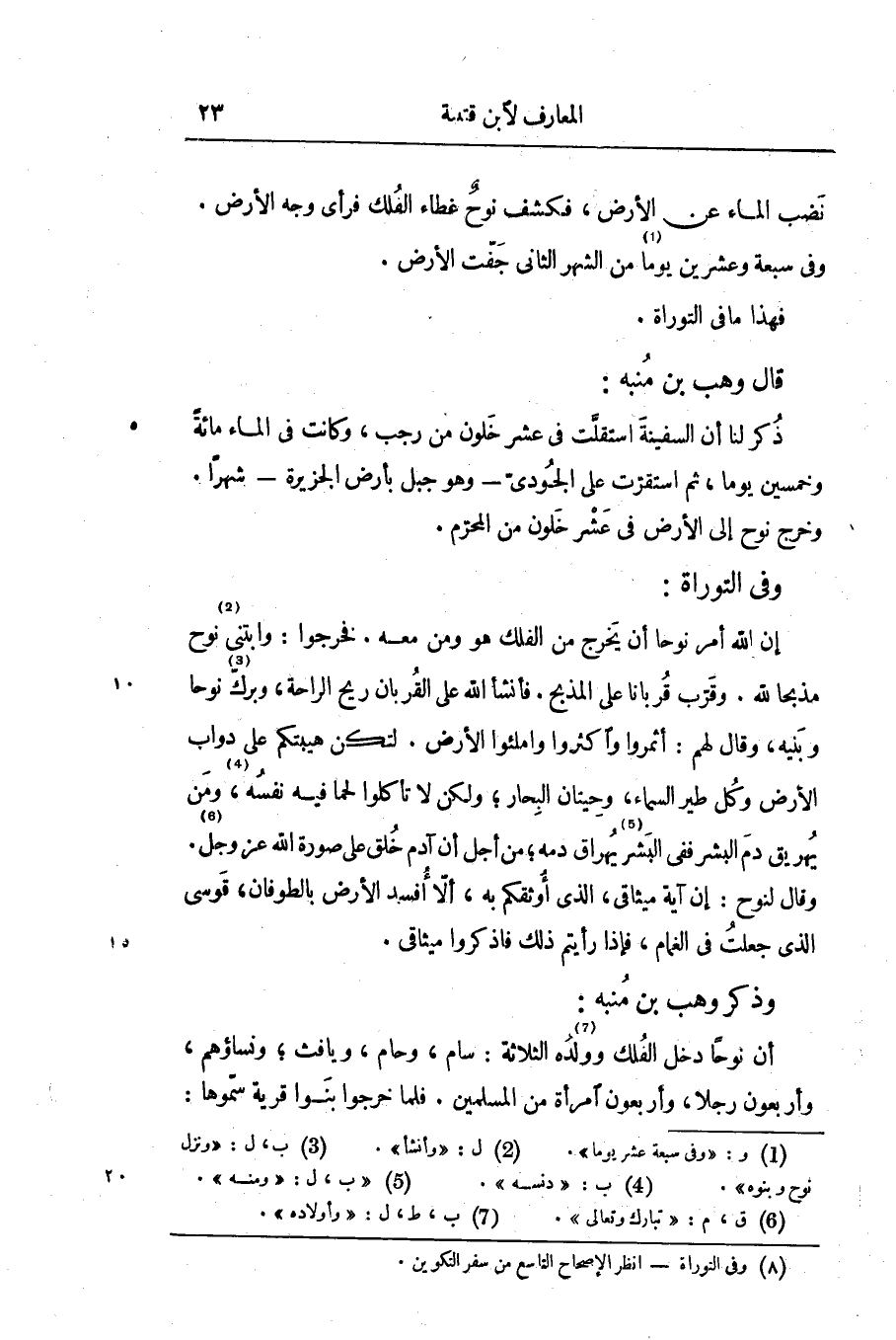 وفي التوراة: «1» إن الله أمر نوحا أن يخرج من الفلك هو ومن معه. فخرجوا: وابتنى [2] نوح مذبحا للَّه. وقرّب قربانا على المذبح. فأنشأ الله على القربان ريح الراحة، وبرك [3] نوحا وبنيه، وقال لهم: أثمروا وأكثروا واملئوا الأرض. لتكن هيبتكم على دواب الأرض وكل طير السماء، وحيتان البحار، ولكن لا تأكلوا لحما فيه نفسه، [4] ومن يهريق دم البشر ففي البشر [5] يهراق دمه، من أجل أن آدم خلق على صورة الله عز وجل. [6] وقال لنوح: إن آية ميثاقي، الّذي أوثقكم به، ألّا أفسد الأرض بالطوفان، قوسى الّذي جعلت في الغمام، فإذا رأيتم ذلك فاذكروا ميثاقي.