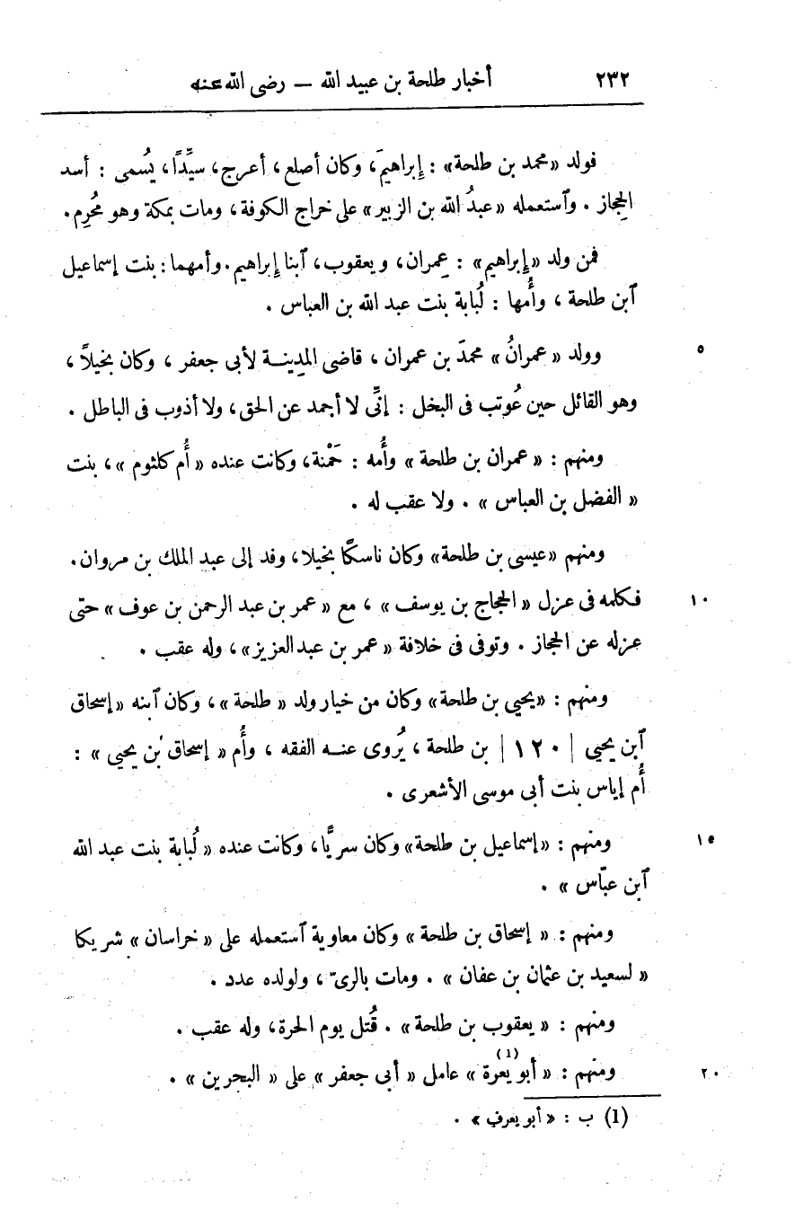 ومنهم: «يحيى بن طلحة» وكان من خيار ولد «طلحة» ، وكان ابنه «إسحاق ابن يحيى/ 120/ بن طلحة، يروى عنه الفقه، وأم «إسحاق بن يحيى» :