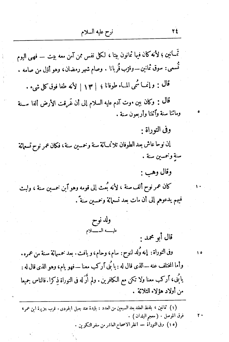 وفي التوراة «2» : إنه ولد لنوح: سام، وحام، ويافث. بعد خمسمائة سنة من عمره.
