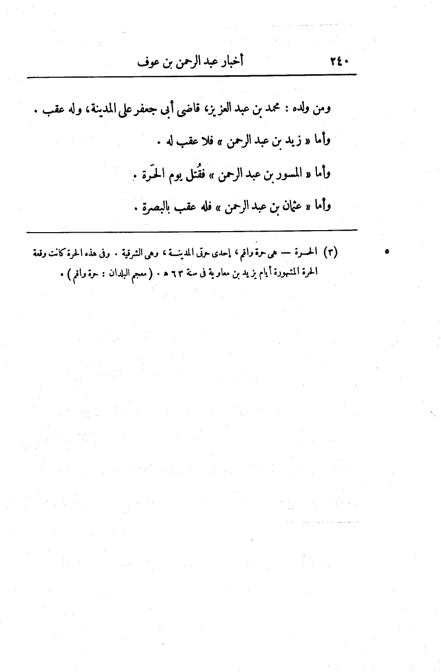 وأما «المسور بن عبد الرحمن» فقتل يوم الحرة «1» وأما «عثمان بن عبد الرحمن» فله عقب بالبصرة.