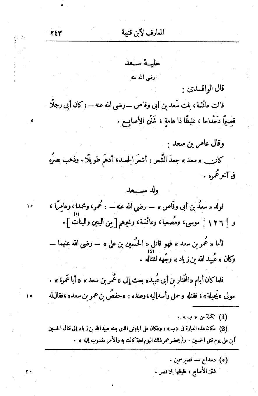 فولد «سعد بن أبى وقّاص» - رضى الله عنه-: عمر، ومحمدا، وعامرا، و/ 126/ موسى، ومصعبا، وعائشة، وغيرهم [من البنين والبنات [1] .