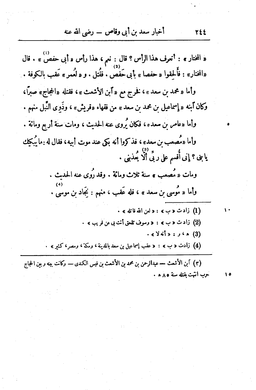 وأما «محمد بن سعد» ، فخرج مع «ابن الأشعث» «1» ، فقتله «الحجاج» صبرا، وكان ابنه «إسماعيل بن محمد بن سعد» من فقهاء «قريش» ، وذوى النّبل منهم.