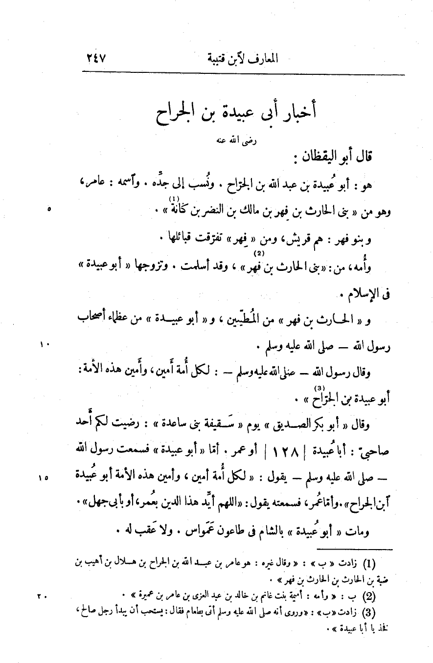 أبو عبيدة بن الجرّاح» [3] . وقال «أبو بكر الصديق» يوم «سقيفة بنى ساعدة» : رضيت لكم أحد صاحبىّ: أبا عبيدة/ 128/ أو عمر. أمّا «أبو عبيدة» فسمعت رسول الله- صلّى الله عليه وسلّم- يقول: «لكل أمة أمين، وأمين هذه الأمة أبو عبيدة ابن الجراح» . وأمّا عمر، فسمعته يقول: «اللَّهمّ أيّد هذا الدين بعمر، أو بأبي جهل» . ومات «أبو عبيدة» بالشام في طاعون عمواس. ولا عقب له.
