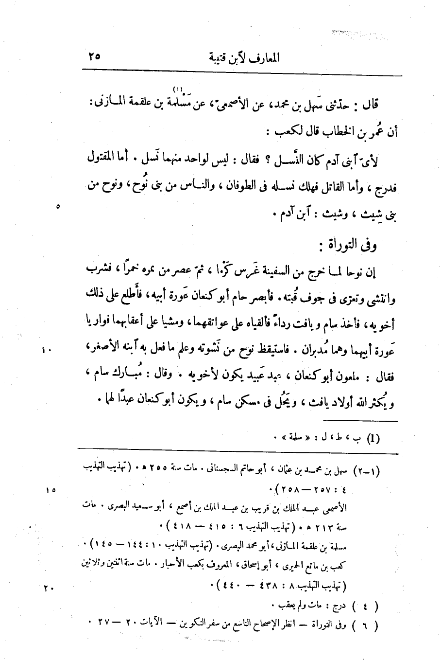 أن عمر بن الخطاب قال لكعب: «1» لأيّ ابني آدم كان النّسل؟ فقال: ليس لواحد منهما نسل. أما المقتول فدرج «2» ، وأما القاتل فهلك نسله في الطوفان، والناس من بنى نوح، ونوح من بنى شيث، وشيث: ابن آدم.