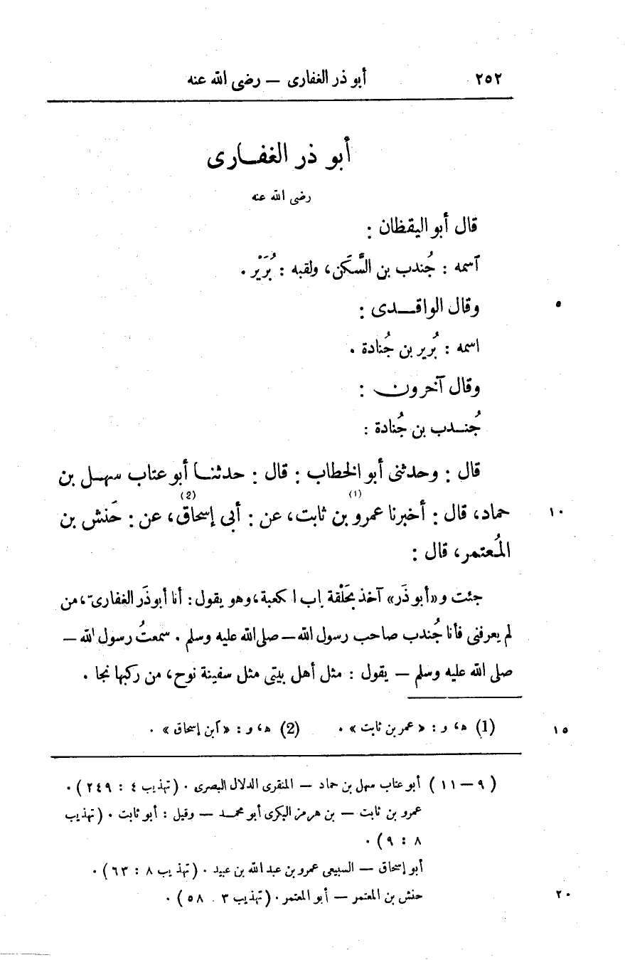 جئت و «أبو ذر» آخذ بحلقة باب الكعبة، وهو يقول: أنا أبو ذر الغفاريّ، من لم يعرفني فأنا جندب صاحب رسول الله- صلّى الله عليه وسلّم. سمعت رسول الله- صلّى الله عليه وسلّم- يقول: مثل أهل بيتي مثل سفينة نوح، من ركبها نجا.
