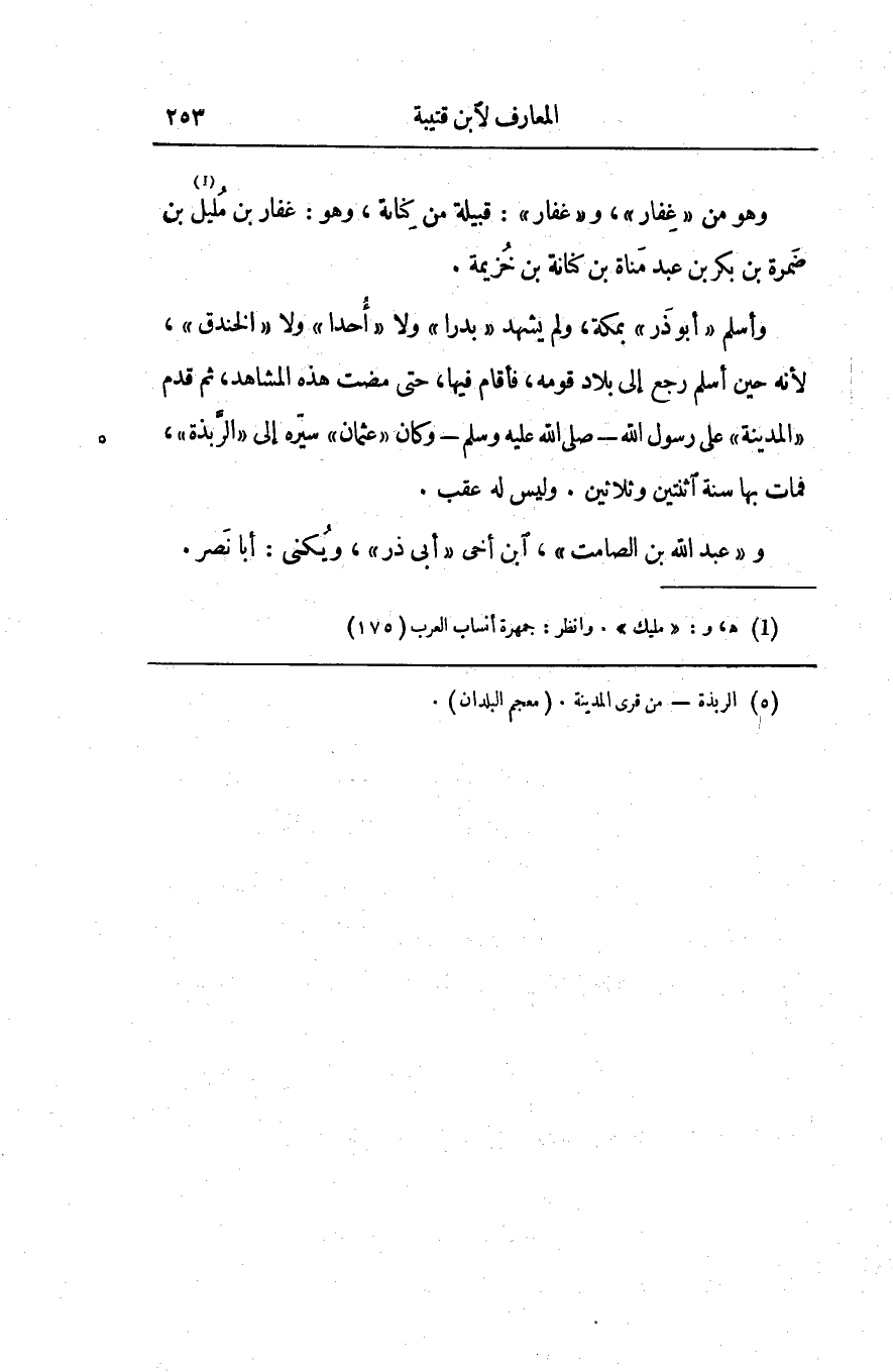 وأسلم «أبو ذر» بمكة، ولم يشهد «بدرا» ولا «أحدا» ولا «الخندق» ، لأنه حين أسلم رجع إلى بلاد قومه، فأقام فيها، حتى مضت هذه المشاهد، ثم قدم «المدينة» على رسول الله- صلّى الله عليه وسلّم- وكان «عثمان» سيّره إلى «الرّبذة» «1» ، فمات بها سنة اثنتين وثلاثين. وليس له عقب.