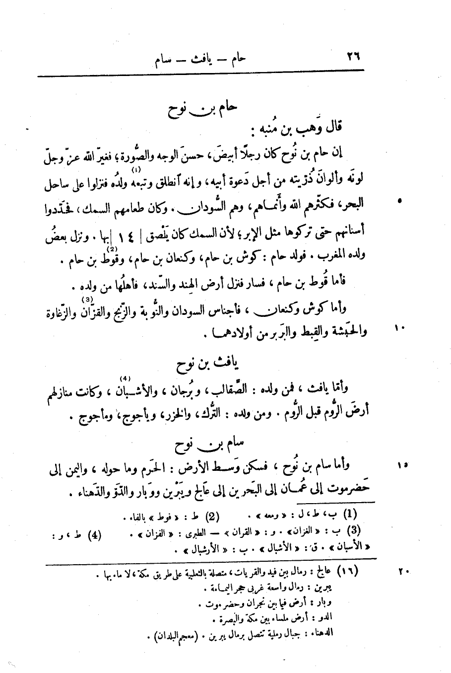 إن حام بن نوح كان رجلا أبيض، حسن الوجه والصّورة، فغيّر الله عزّ وجلّ لونه وألوان ذرّيته من أجل دعوة أبيه، وإنه انطلق وتبعه [1] ولده فنزلوا على ساحل البحر، فكثّرهم الله وأنماهم، وهم السّودان. وكان طعامهم السمك، فحدّدوا أسنانهم حتى تركوها مثل الإبر، لأن السمك كان يلصق/ 14/ بها. ونزل بعض ولده المغرب. فولد حام: كوش بن حام، وكنعان بن حام، وقوط [2] بن حام.