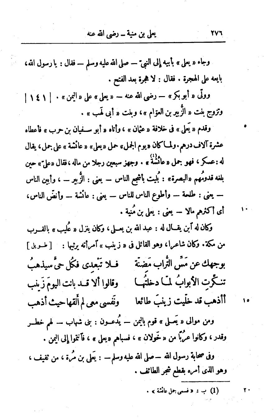 وقدم «يعلى» في خلافة «عثمان» ، وأتاه «أبو سفيان بن حرب» فأعطاه عشرة آلاف درهم. ولما كان «يوم الجمل» حمل «يعلى» «عائشة» على جمل، يقال له: عسكر، فهو جمل «عائشة» [1] . وجهز سبعين رجلا من ماله، فقال «عليّ» حين بلغه قدومهم «البصرة» : بليت بأشجع الناس- يعنى: الزّبير-، وأبين الناس- يعنى: طلحة- وأطوع الناس للناس- يعنى: عائشة- وأنضّ الناس، أي أكثرهم مالا- يعنى: يعلى بن منية.