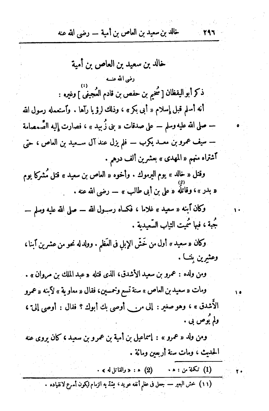 وقتل «خالد» يوم اليرموك. وأخوه «العاص بن سعيد» قتل مشركا يوم «بدر» ، وقاتله [2] «على بن أبى طالب» - رضى الله عنه.
