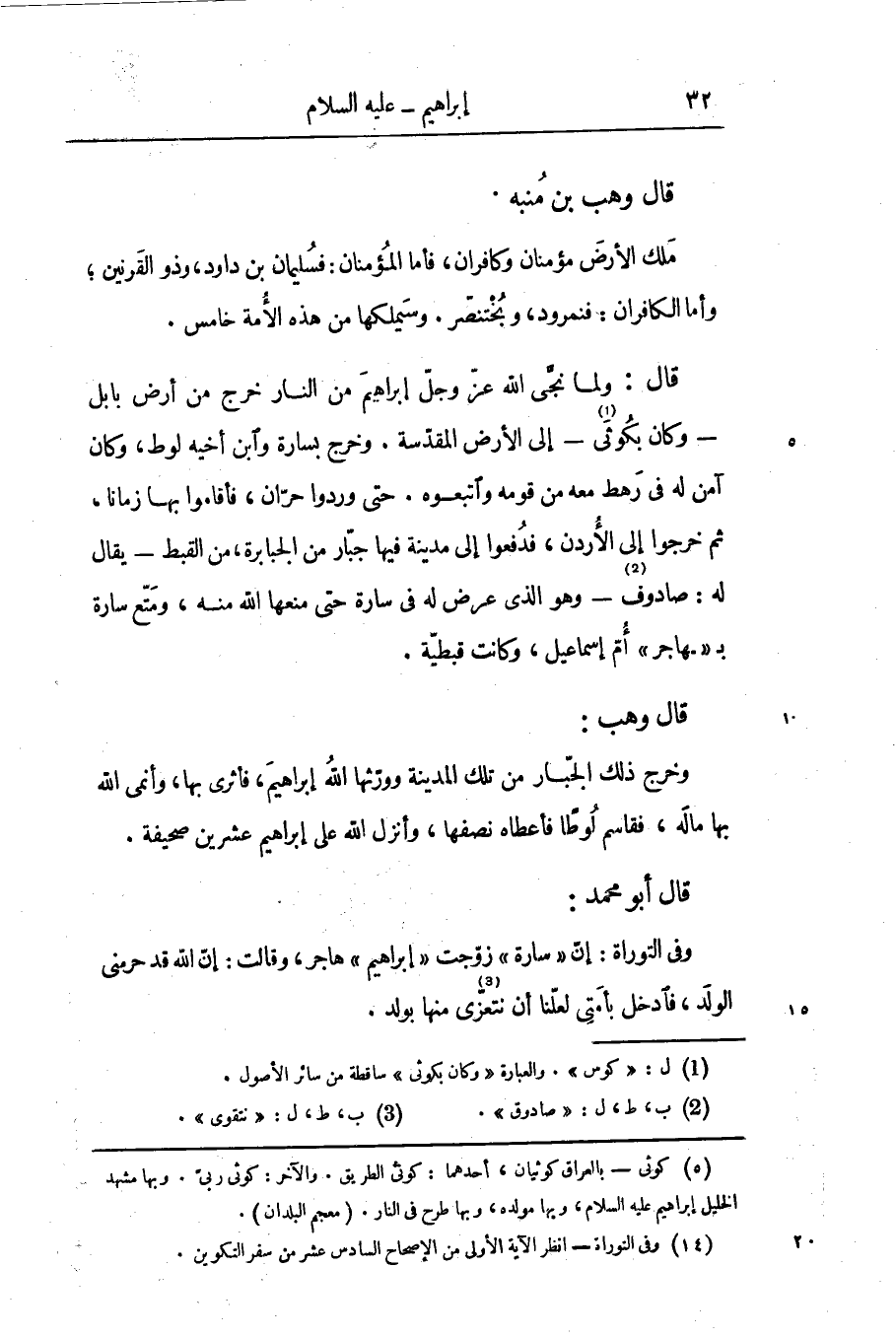 قال: ولما نجّى الله عزّ وجلّ إبراهيم من النار خرج من أرض بابل- وكان بكوثى- «1» [1] إلى الأرض المقدّسة. وخرج بسارة وابن أخيه لوط، وكان آمن له في رهط معه من قومه واتبعوه. حتى وردوا حرّان، فأقاموا بها زمانا، ثم خرجوا إلى الأردن، فدفعوا إلى مدينة فيها جبّار من الجبابرة، من القبط- يقال له: صادوف [2]- وهو الّذي عرض له في سارة حتى منعها الله منه، ومتّع سارة ب «هاجر» أمّ إسماعيل، وكانت قبطيّة.