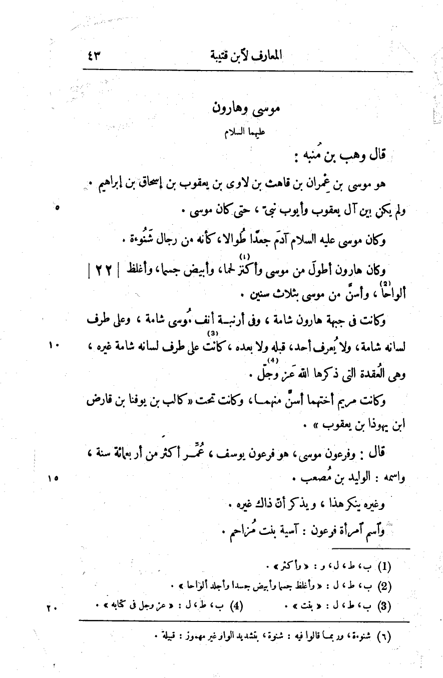 وكانت في جبهة هارون شامة، وفي أرنبة أنف موسى شامة، وعلى طرف لسانه شامة، ولا يعرف أحد، قبله ولا بعده، كانت [3] على طرف لسانه شامة غيره، وهي العقدة التي ذكرها الله عز وجلّ [4] .