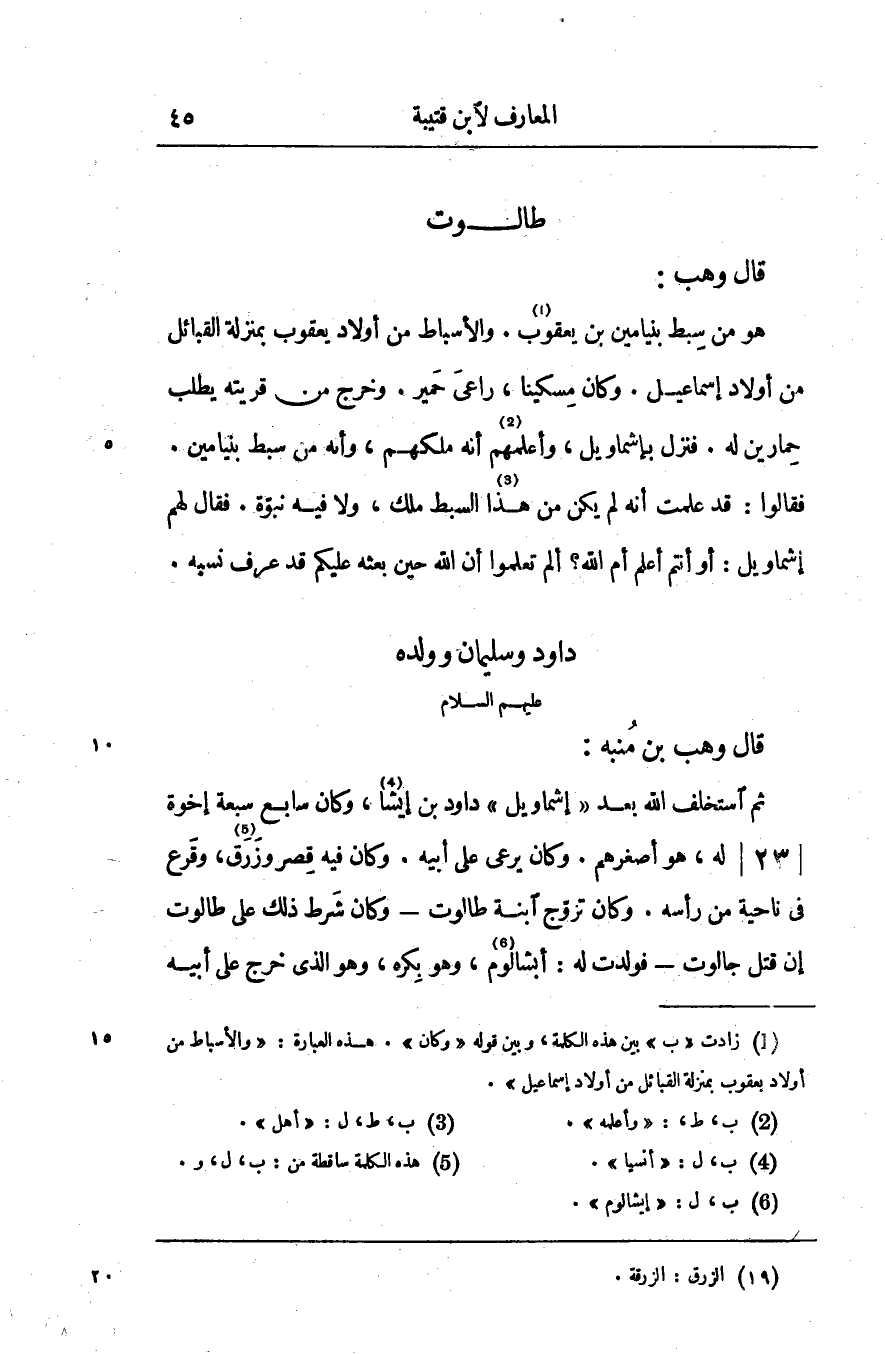 ثم استخلف الله بعد «إشماويل» داود بن إيشا [4] ، وكان سابع سبعة إخوة/ 23/ له، هو أصغرهم. وكان يرعى على أبيه. وكان فيه قصر وزرق «1» [5] ، وقرع في ناحية من رأسه. وكان تزوّج ابنة طالوت- وكان شرط ذلك على طالوت إن قتل جالوت- فولدت له: أبشالوم [6] ، وهو بكرة، وهو الّذي خرج على أبيه