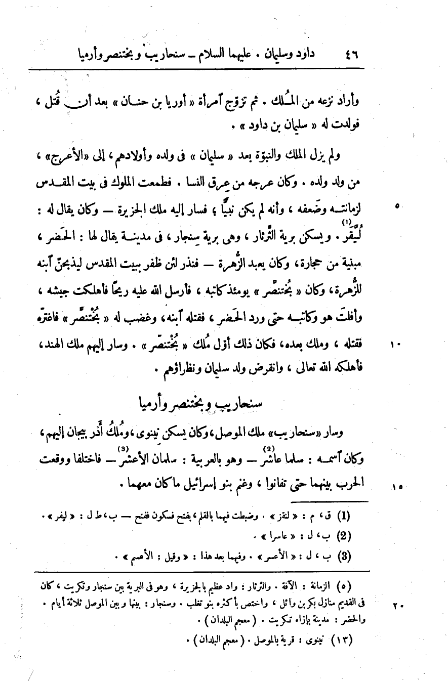 ليّقر [1] . ويسكن برية الثّرثار، وهي برية سنجار، في مدينة يقال لها: الحضر، مبنية من حجارة، وكان يعبد الزّهرة- فنذر لئن ظفر ببيت المقدس ليذبحنّ ابنه للزّهرة، وكان «بخت نصّر» يومئذ كاتبه، فأرسل الله عليه ريحا فأهلكت جيشه، وأفلت هو وكاتبه حتى ورد الحضر، فقتله ابنه، وغضب له «بخت نصّر» فاغترّه فقتله، وملك بعده، فكان ذلك أوّل ملك «بخت نصّر» . وسار إليهم ملك الهند، فأهلكه الله تعالى، وانقرض ولد سليمان ونظراؤهم.