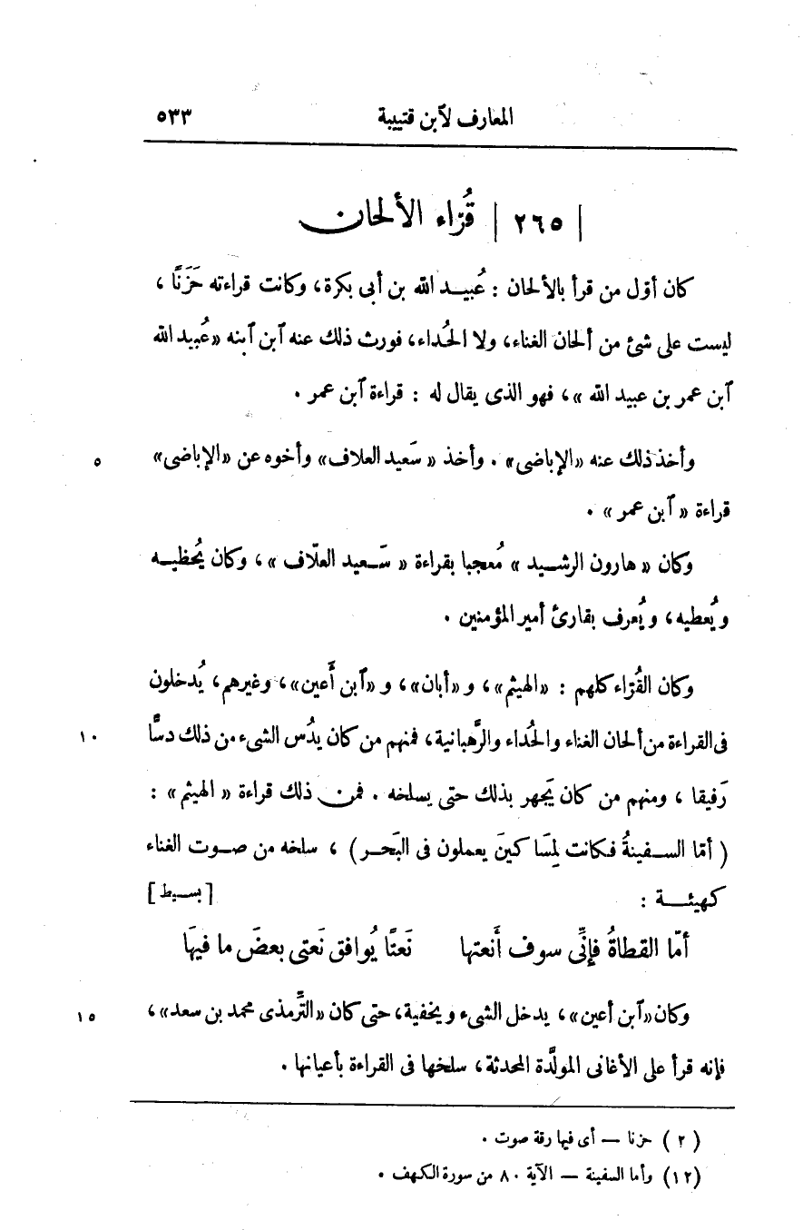 وكان القرّاء كلهم: «الهيثم» ، و «أبان» ، و «ابن أعين» ، وغيرهم، يدخلون في القراءة من ألحان الغناء والحداء والرّهبانية، فمنهم من كان يدس الشيء من ذلك دسّا رفيقا، ومنهم من كان يجهر بذلك حتى يسلخه. فمن ذلك قراءة «الهيثم» :