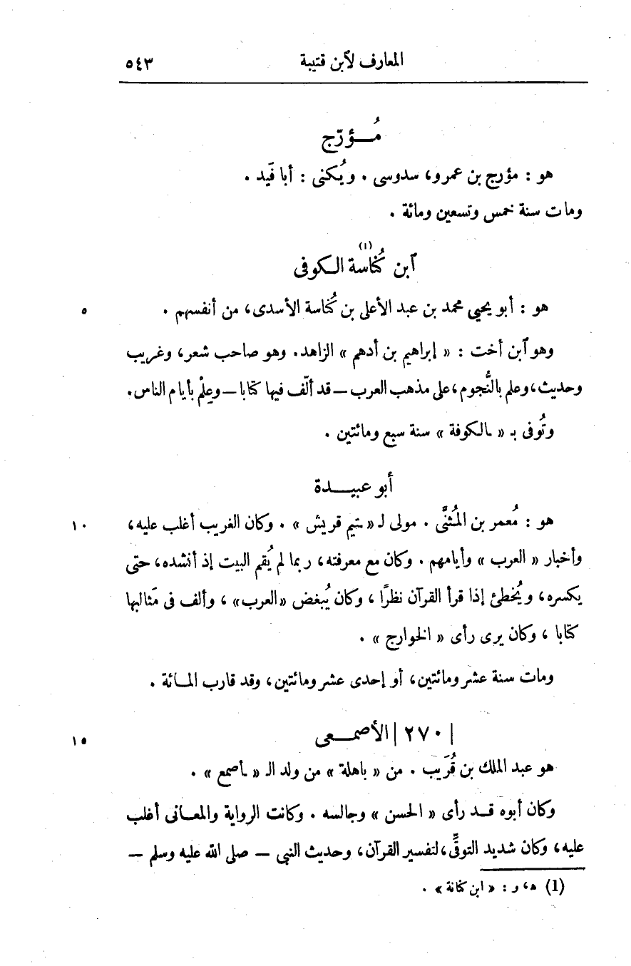 هو: معمر بن المثنّى. مولى ل «تيم قريش» . وكان الغريب أغلب عليه، وأخبار «العرب» وأيامهم. وكان مع معرفته، ربما لم يقم البيت إذ أنشده، حتى يكسره، ويخطئ إذا قرأ القرآن نظرا، وكان يبغض «العرب» ، وألف في مثالبها كتابا، وكان يرى رأى «الخوارج» .