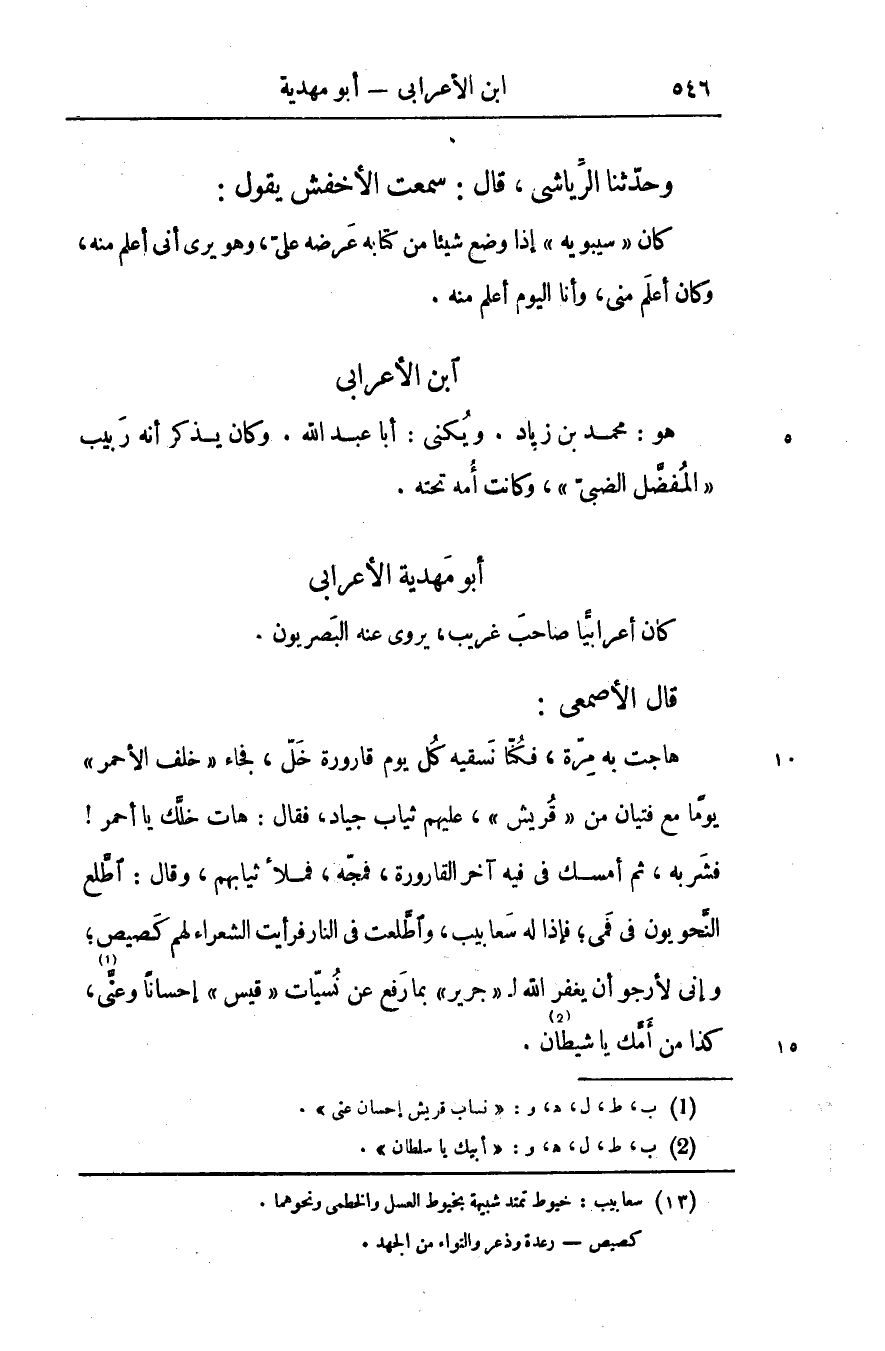 هاجت به مرّة، فكنّا نسقيه كل يوم قارورة خلّ، فجاء «خلف الأحمر» يوما مع فتيان من «قريش» ، عليهم ثياب جياد، فقال: هات خلّك يا أحمر! فشربه، ثم أمسك في فيه آخر القارورة، فمجّه، فملأ ثيابهم، وقال: اطّلع النّحويون في فمي، فإذا له سعابيب «1» ، واطّلعت في النار فرأيت الشعراء لهم كصيص، وإني لأرجو أن يغفر الله ل «جرير» بما رفع عن نسيّات «قيس» إحسانا وعنّي [1] ، كذا من أمّك يا شيطان [2] .
