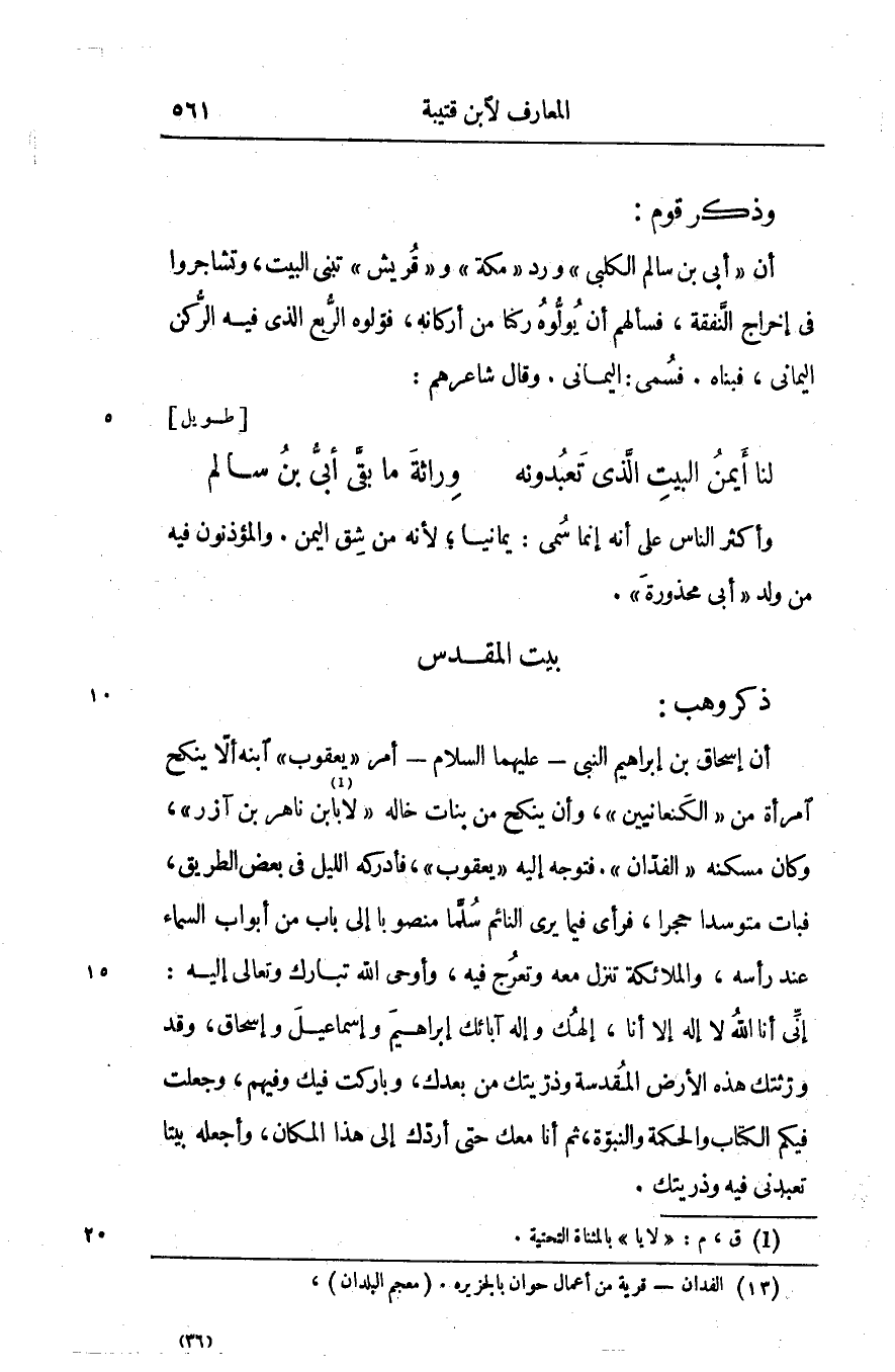 أن إسحاق بن إبراهيم النبي- عليهما السلام- أمر «يعقوب» ابنه ألّا ينكح امرأة من «الكنعانيين» ، وأن ينكح من بنات خاله «لا [1] بابن ناهر بن آزر» ، وكان مسكنه «الفدّان» «1» . فتوجه إليه «يعقوب» ، فأدركه الليل في بعض الطريق، فبات متوسدا حجرا، فرأى فيما يرى النائم سلّما منصوبا إلى باب من أبواب السماء عند رأسه، والملائكة تنزل معه وتعرج فيه، وأوحى الله تبارك وتعالى إليه: