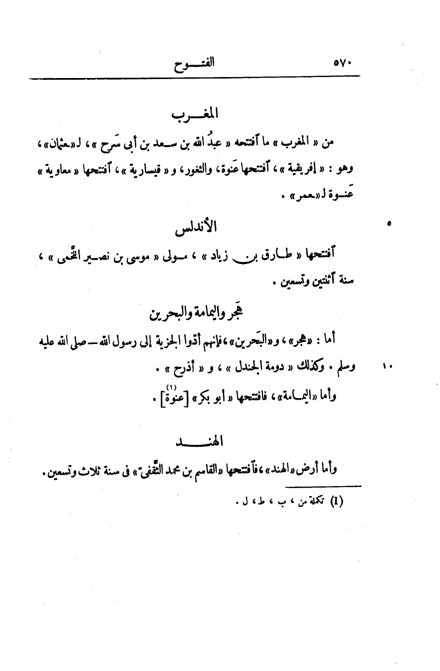 من «المغرب» ما افتتحه «عبد الله بن سعد بن أبى سرح» ، ل «عثمان» ، وهو: «إفريقية» ، افتتحها عنوة، والثغور، و «قيسارية» ، افتتحها «معاوية» عنوة ل «عمر» .