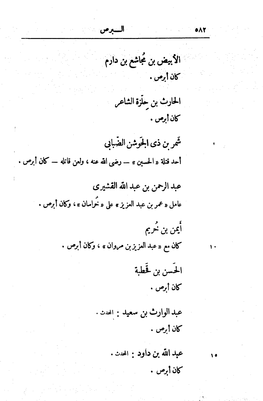 شمر بن ذي الجوشن الضّبابى أحد قتلة «الحسين» - رضى الله عنه، ولعن قاتله- كان أبرص.