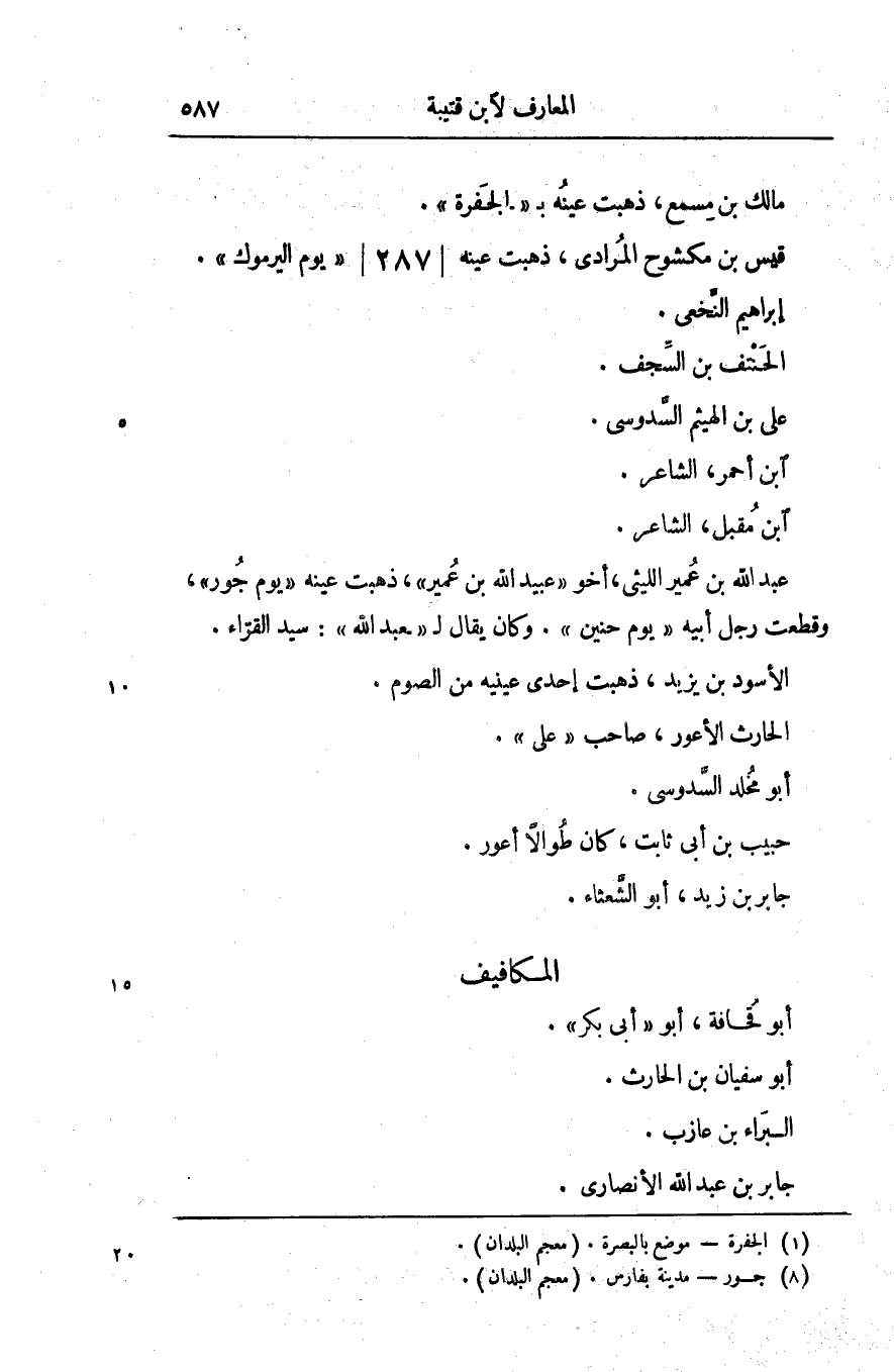 مالك بن مسمع، ذهبت عينه ب «الجفرة» . «1» قيس بن مكشوح المرادي، ذهبت عينه/ 287/ «يوم اليرموك» .