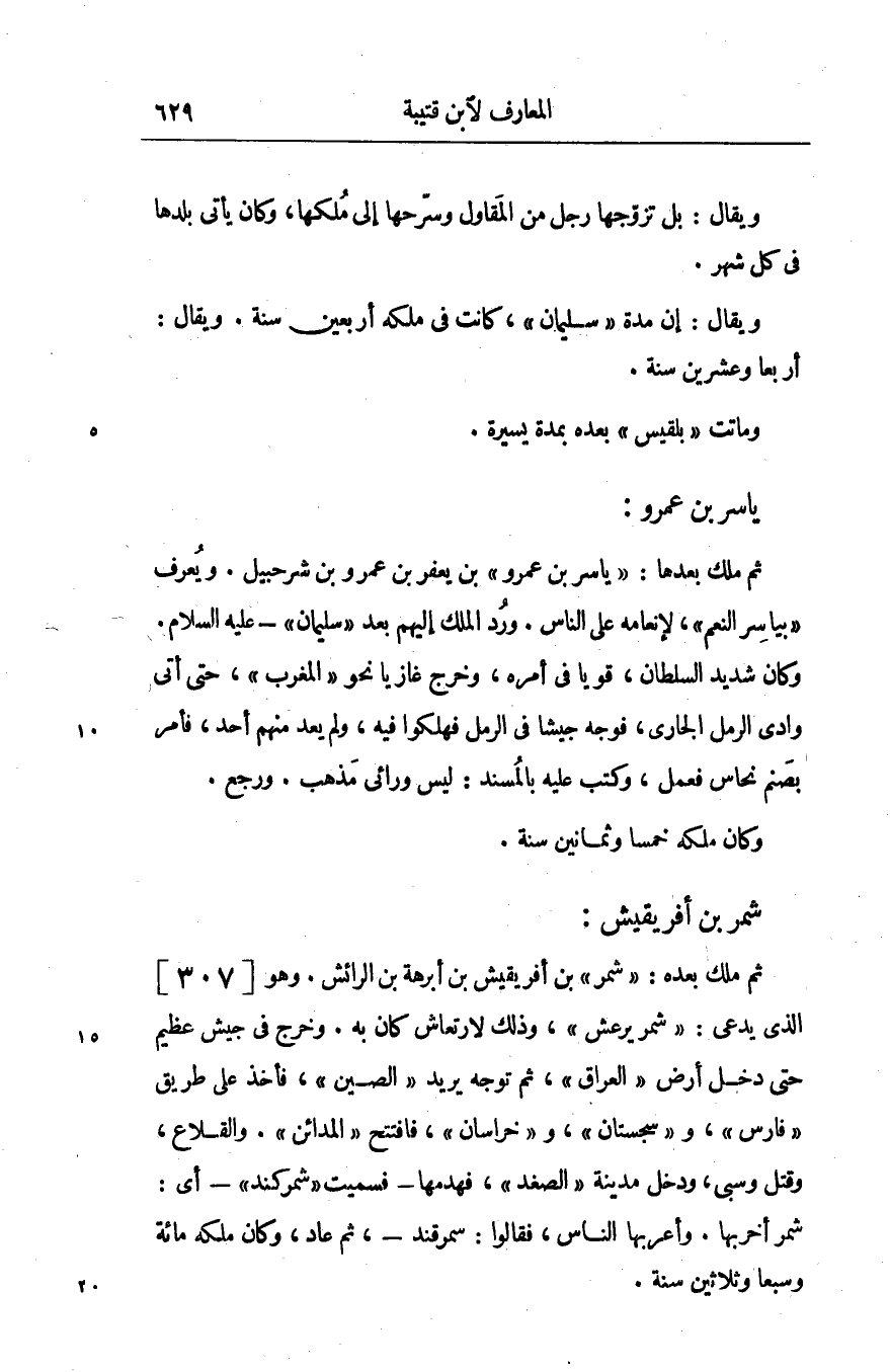شمر أخربها. وأعربها الناس، فقالوا: سمرقند-، ثم عاد، وكان ملكه مائة وسبعا وثلاثين سنة.