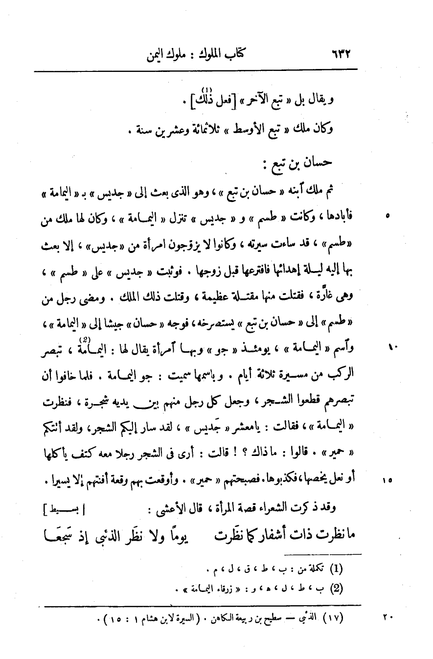 ثم ملك ابنه «حسان بن تبع» ، وهو الّذي بعث إلى «جديس» ب «اليمامة» فأبادها، وكانت «طسم» و «جديس» تنزل «اليمامة» ، وكان لها ملك من «طسم» ، قد ساءت سيرته، وكانوا لا يزوّجون امرأة من «جديس» ، إلا بعث بها إليه ليلة إهدائها فافترعها قبل زوجها. فوثبت «جديس» على «طسم» ، وهي غارّة، فقتلت منها مقتلة عظيمة، وقتلت ذلك الملك. ومضى رجل من «طسم» إلى «حسان بن تبع» يستصرخه، فوجه «حسان» جيشا إلى «اليمامة» ، واسم «اليمامة» ، يومئذ «جو» وبها امرأة يقال لها: اليمامة [2] ، تبصر الركب من مسيرة ثلاثة أيام. وباسمها سميت: جو اليمامة. فلما خافوا أن تبصرهم قطعوا الشجر، وجعل كل رجل منهم بين يديه شجرة، فنظرت «اليمامة» ، فقالت: يا معشر «جديس» ، لقد سار إليكم الشجر، ولقد أتتكم «حمير» . قالوا: ما ذاك؟! قالت: أرى في الشجر رجلا معه كتف يأكلها أو نعل يخصها، فكذبوها. فصبحتهم «حمير» . وأوقعت بهم وقعة أفنتهم إلا يسيرا.