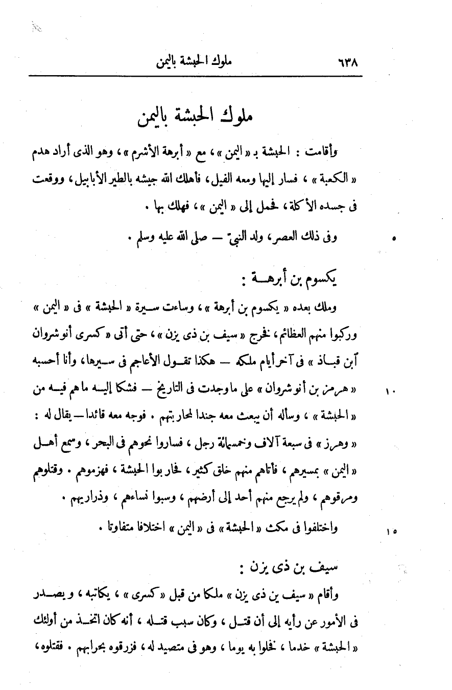 وملك بعده «يكسوم بن أبرهة» ، وساءت سيرة «الحبشة» في «اليمن» وركبوا منهم العظائم، فخرج «سيف بن ذي يزن» ، حتى أتى «كسرى أنوشروان ابن قباذ» في آخر أيام ملكه- هكذا تقول الأعاجم في سيرها، وأنا أحسبه «هرمز بن أنوشروان» على ما وجدت في التاريخ- فشكا إليه ما هم فيه من «الحبشة» ، وسأله أن يبعث معه جندا لمحاربتهم. فوجه معه قائدا- يقال له: